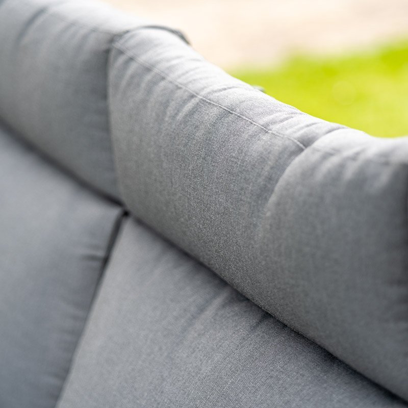 Weiche Polster, die die gesamte Sitz- und Rückenfläche bedecken, sorgen für besonders hohen Komfort. Durch die großzügige Eckform können Sie sich in jeder Position entspannt zurücklehnen. Ein zusätzlicher Vorteil ist die Möglichkeit, die Rückenlehnen an beiden seitlichen Segmenten des Ecksofas abzuklappen – eine praktische Alternative zu Gartenliegen.