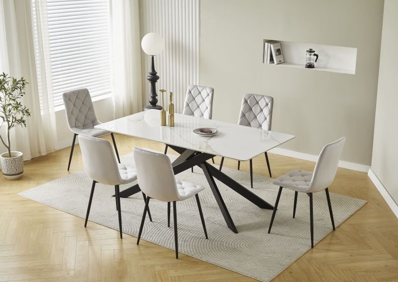 Die Tischplatte besteht aus 12 mm dickem gesintertem Stein und ist mit einem hochglänzenden grauen Marmor-Muster veredelt.