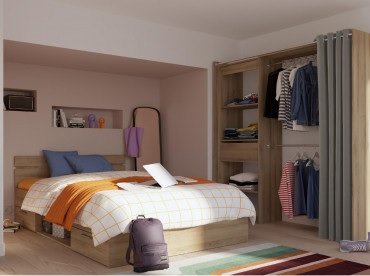 Perfekt für alle, die ein großzügiges Bett an der Wand platzieren möchten, bietet dieses Modell flexible Gestaltungsmöglichkeiten. Zwei Schubladen mit den Maßen 56x33x11 cm sowie ein mittiges Regal mit Abmessungen von 70x36x20 cm lassen sich sowohl links als auch rechts montieren. Die Schubladen gleiten auf robusten Metallschienen.