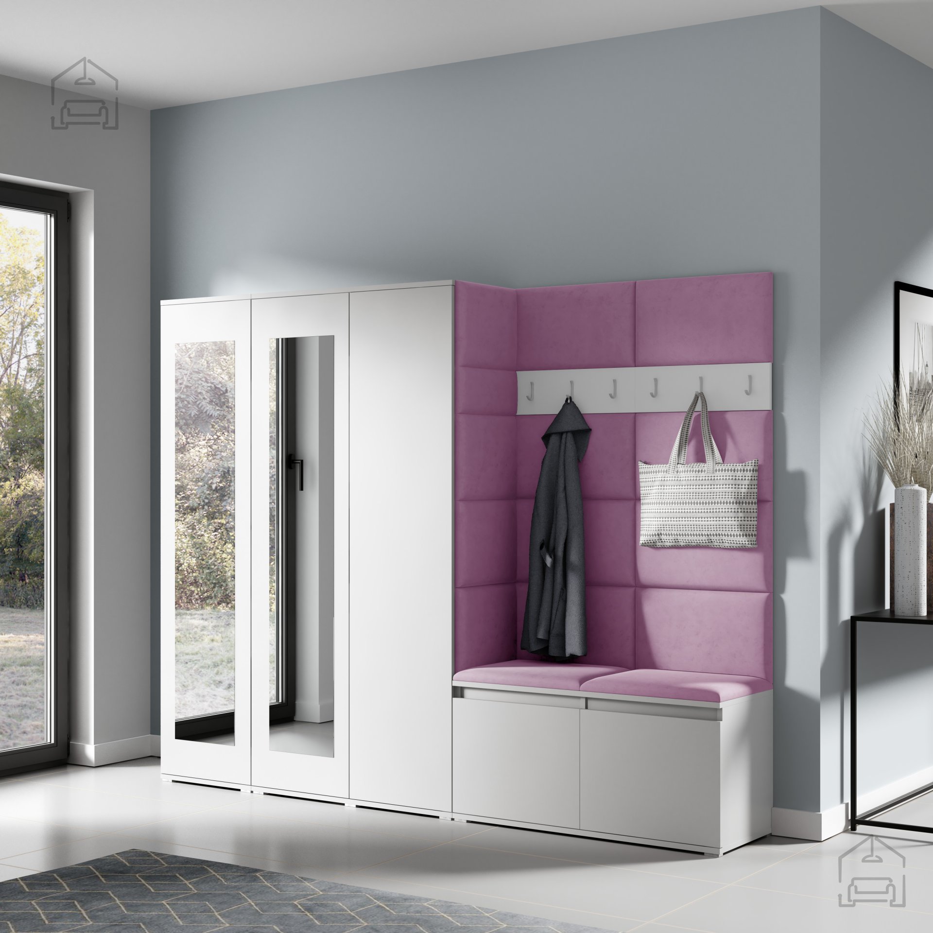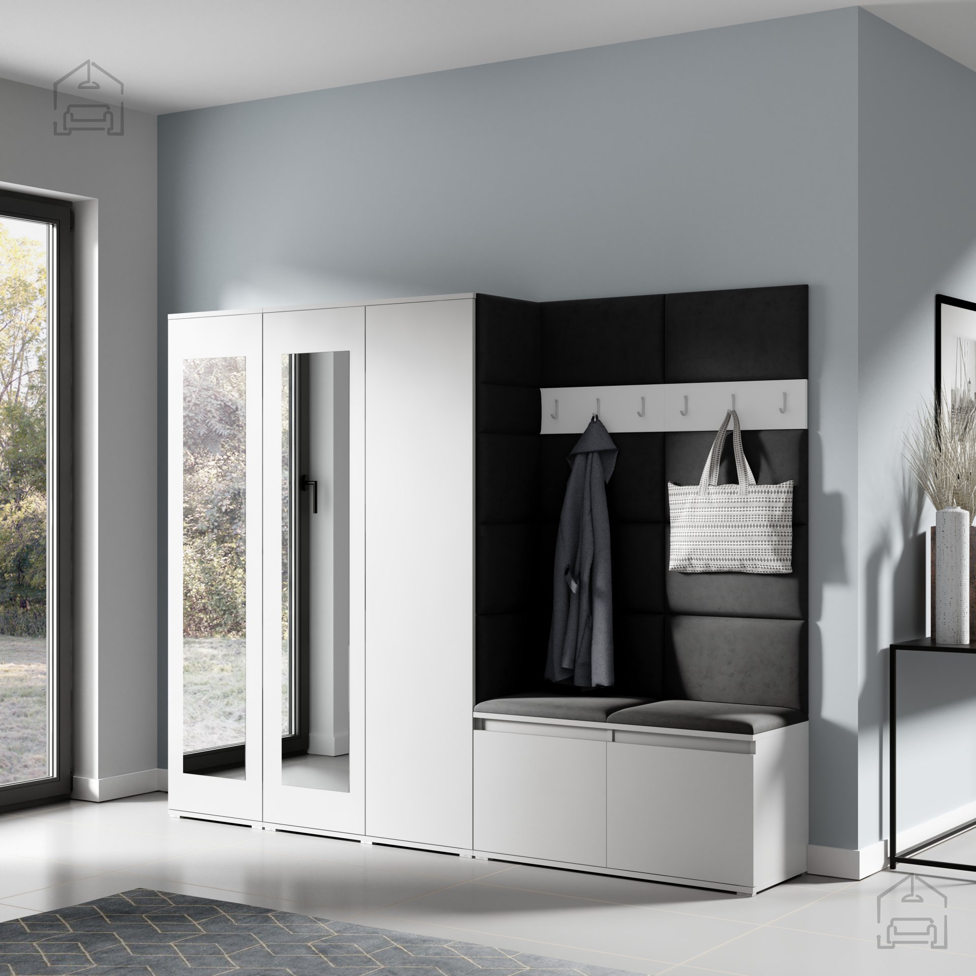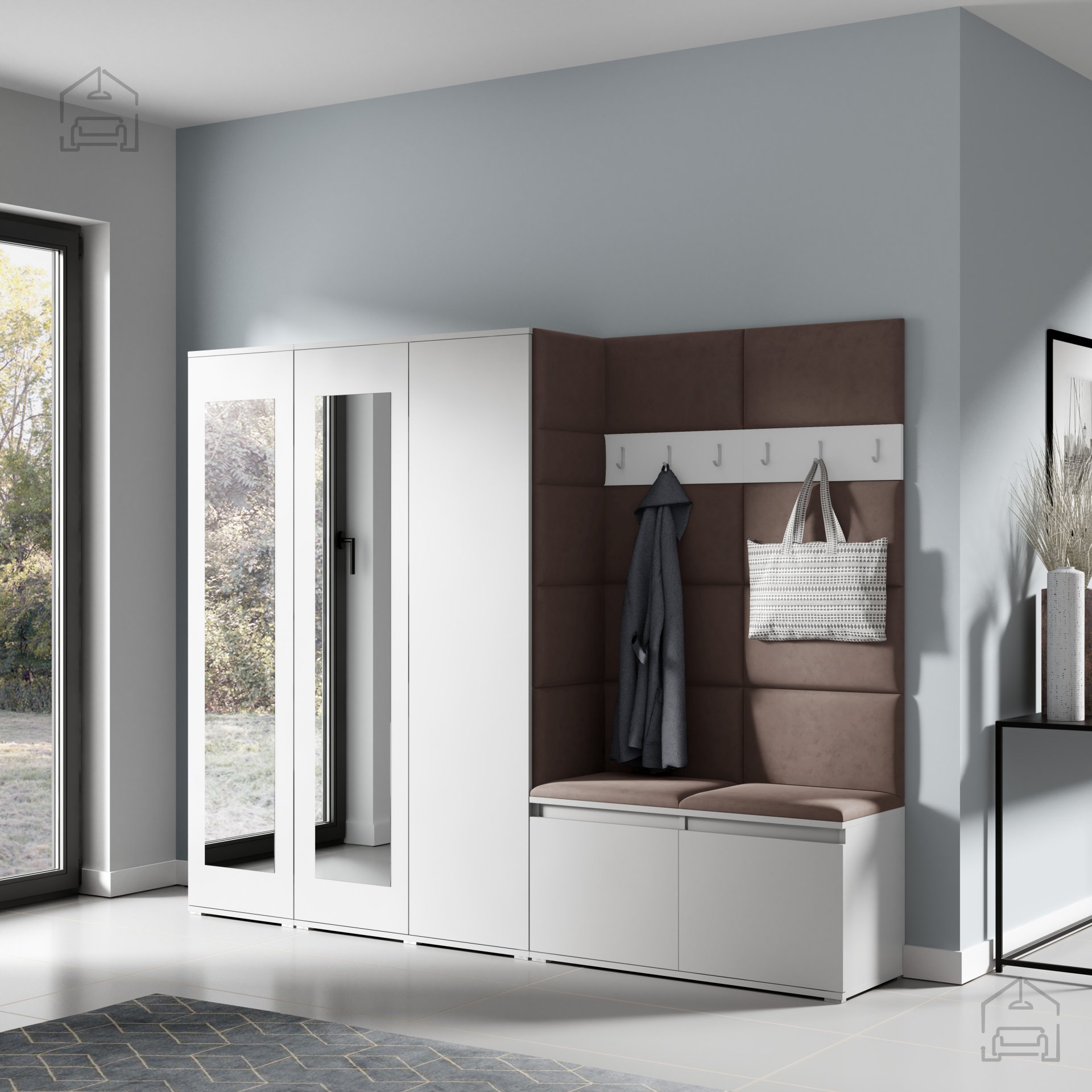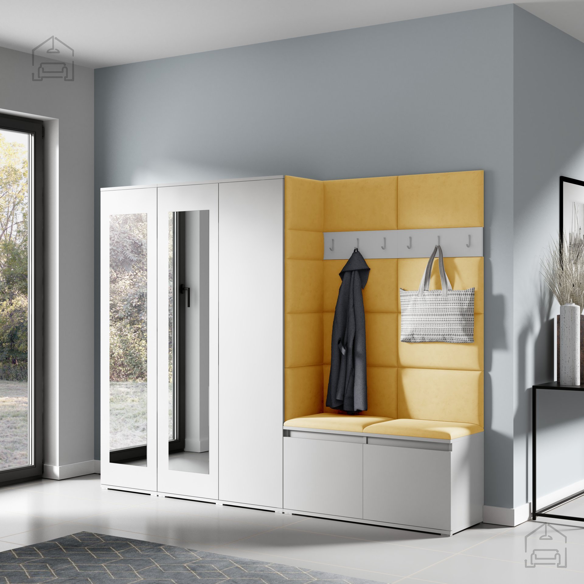 Das Vorzimmer-Set Emi 15 präsentiert sich als stilvolle und platzsparende Möbellösung, die durch ihr schlichtes und modernes Design besticht und Ihrem Raum Struktur und Übersichtlichkeit verleiht. Gefertigt aus hochwertiger Spanplatte, garantiert dieses Möbelset Stabilität und Langlebigkeit und eignet sich hervorragend für den Einsatz im Eingangsbereich, Flur oder Ankleidezimmer. Das stilvolle Erscheinungsbild des Sets wertet Ihr Zuhause optisch auf. Die gepolsterten Paneele werden direkt an Wand und Schrank befestigt.