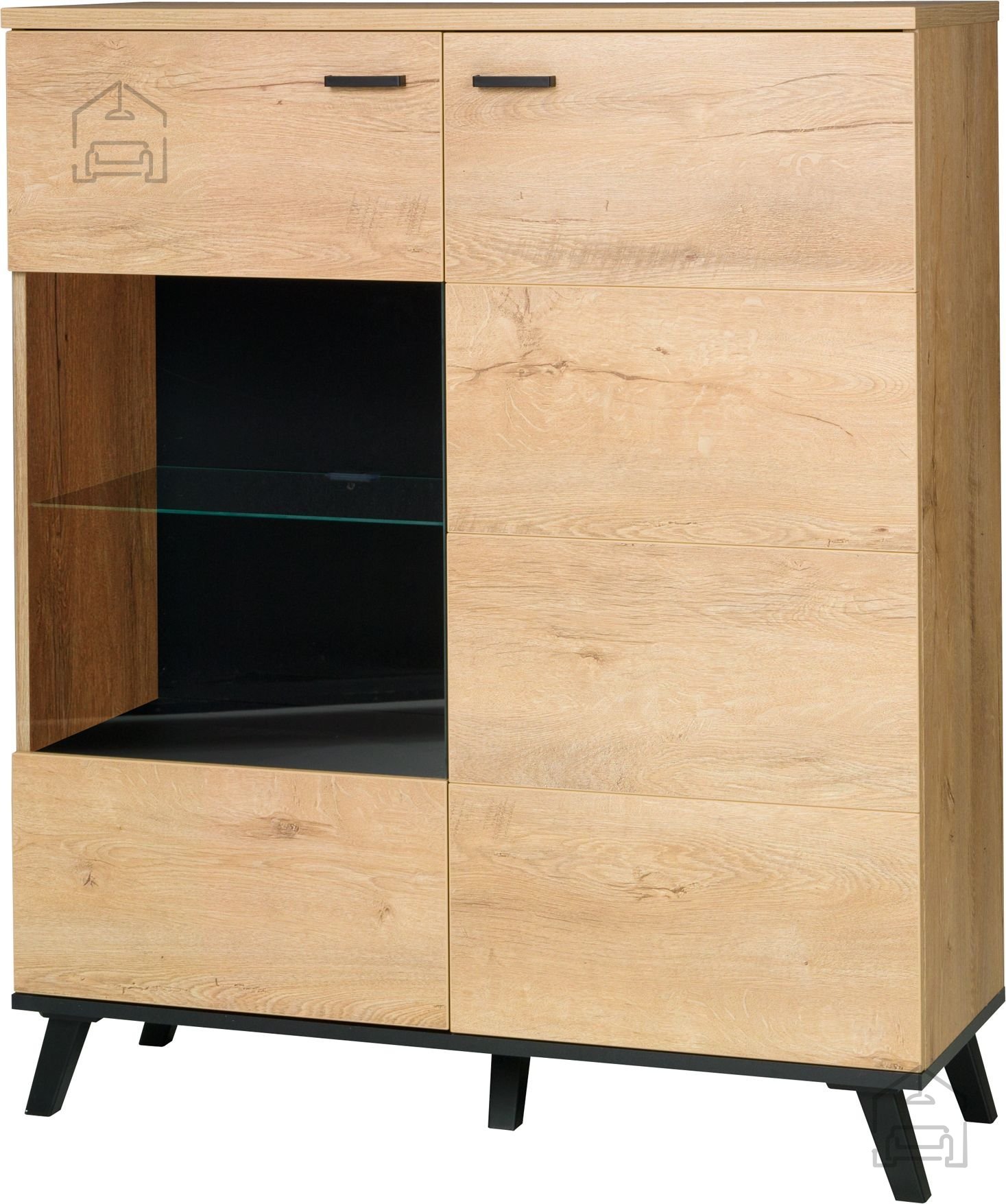 Die breite zweitürige Vitrine John wurde mit Blick auf praktische Nutzung und ästhetischen Eindruck entworfen. Das zweitürige Design ermöglicht eine übersichtliche Anordnung des Innenraums, wo Sie dekorative Gegenstände, Bücher oder Geschirr ausstellen können, während andere Fächer und geschlossene Bereiche diskretes Aufbewahren der Dinge ermöglichen, die Sie nicht sichtbar haben möchten. Aufgrund der schlichten, klaren Linien und des universellen Erscheinungsbildes fügt sich die Vitrine harmonisch in verschiedene Einrichtungsstile ein – vom modernen Minimalismus bis hin zum rustikalen Ambiente.