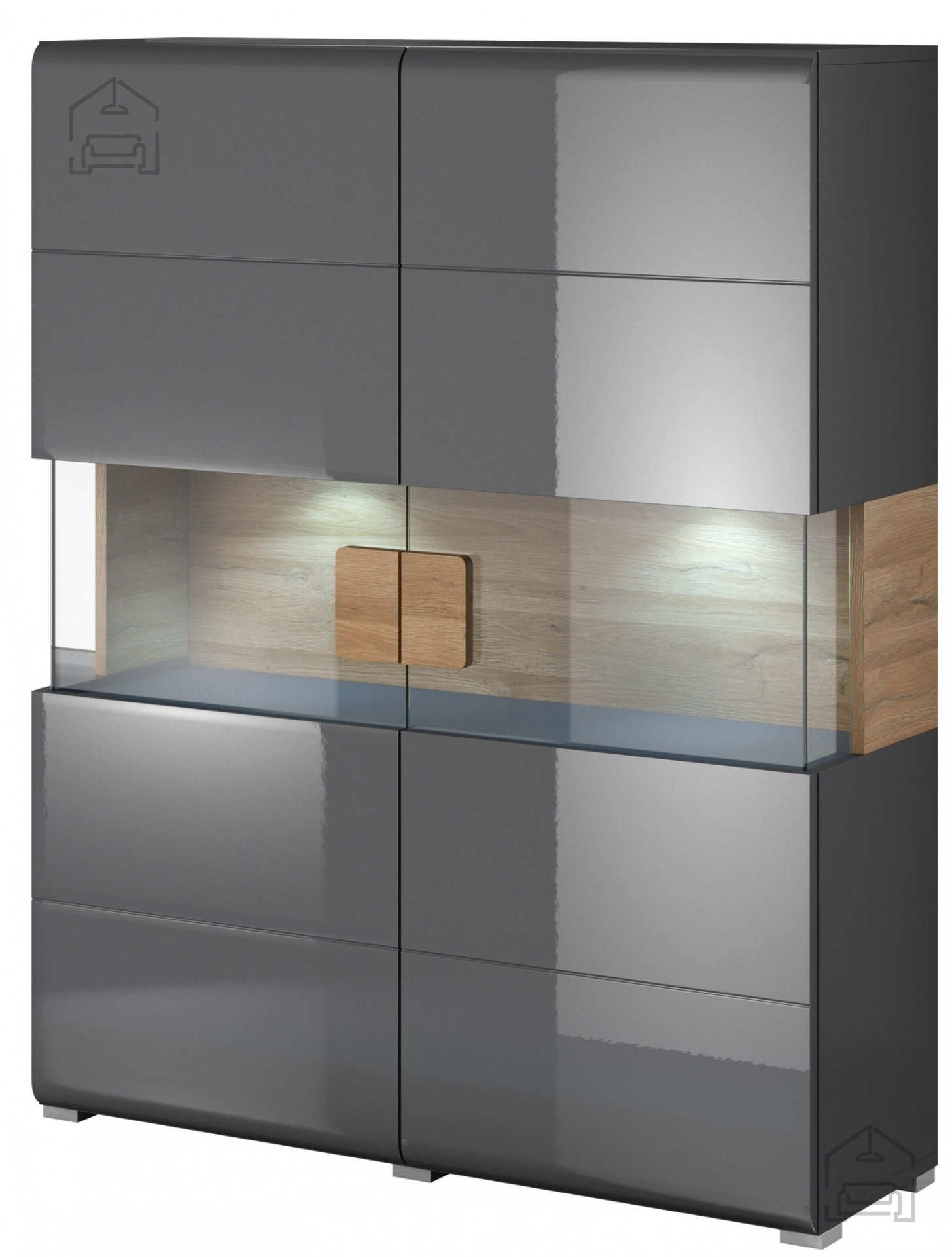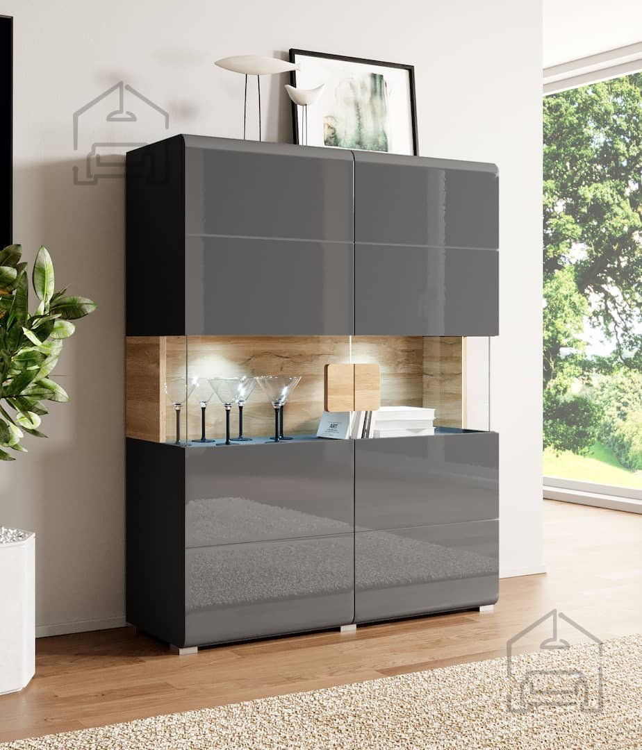 Die Vitrine Toledo ist ideal für alle, die Funktionalität und Ästhetik vereinen möchten. Dank ihres großzügigen Stauraums bietet sie genügend Platz für Ihre liebsten Stücke und ermöglicht es gleichzeitig, durch die Glastüren dekorative Gegenstände schön in Szene zu setzen. Der anthrazitfarbene Korpus in Kombination mit Grandson-Eiche verleiht Ihrem Wohnraum einen modernen, harmonischen Charakter.