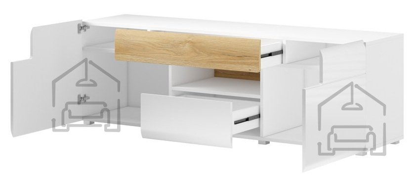 Der TV-Schrank Toledo 2 hat die Maße 159x39x47 cm und passt damit ideal in Räume unterschiedlicher Größe. Gefertigt ist er aus hochwertigem MDF, das für Stabilität und Langlebigkeit steht. MDF ist bekannt für seine Feuchtigkeits- und Verformungsbeständigkeit – so behält Ihr Schrank auch nach Jahren seine schöne Optik.