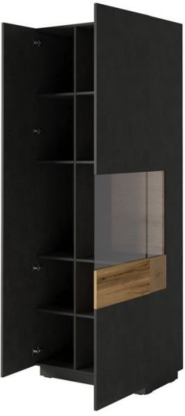 Entdecken Sie zeitlose Eleganz und Funktionalität mit der Vitrine Silke rechts in der edlen Kombination aus mattem Schwarz und Eiche Votan. Dieses beeindruckende Möbelstück wird garantiert zum Blickfang in jedem Raum und bringt moderne Ästhetik und praktische Nutzbarkeit in Ihr Zuhause.
