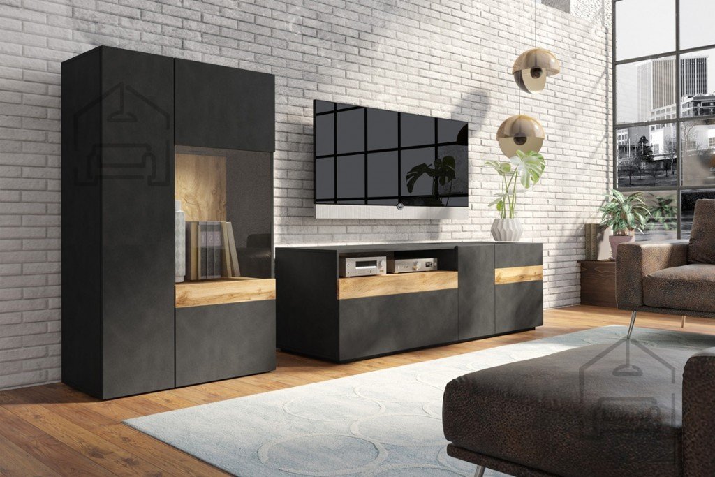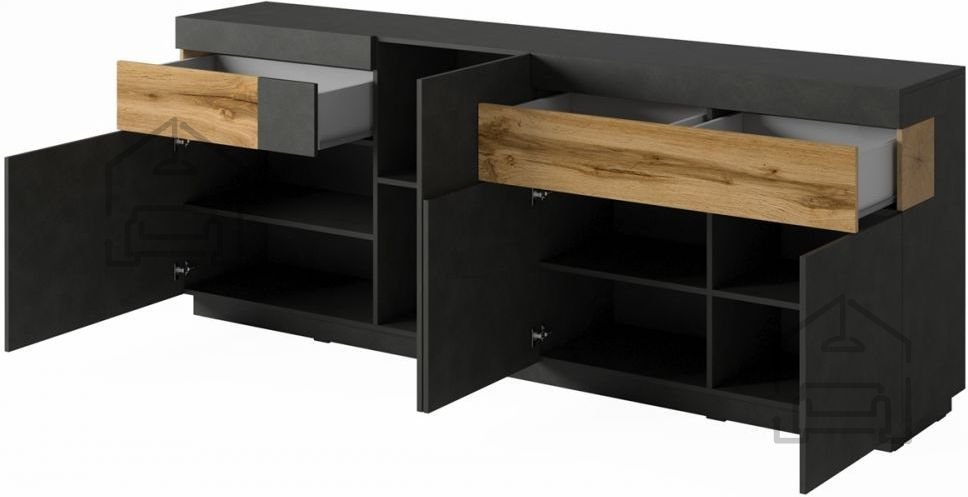 Mit den Abmessungen 219x40x85 cm bietet die Kommode Silke 1 großzügigen Stauraum, ohne dabei zu viel Platz einzunehmen. Die elegante, schwarze matte Korpusfarbe harmoniert perfekt mit der Front in Eiche Wotan und sorgt für ein edles, ansprechendes Erscheinungsbild, das sich mühelos in jedes Wohnambiente einfügt.