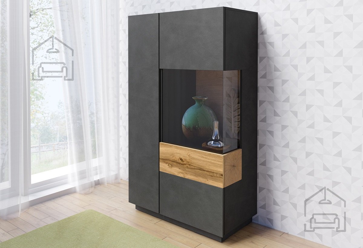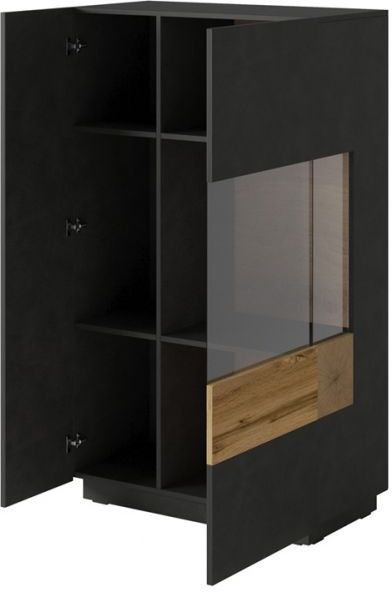 Die hohe Vitrine Silke 2 – Schwarz Matt/Eiche Votan – 241NGY44 ist die ideale Wahl für alle, die ihrem Zuhause einen Hauch moderner Eleganz und Funktionalität verleihen möchten. Mit den Maßen 80x40x139 cm fügt sich dieses Möbelstück harmonisch in jeden Raum ein – ob Wohnzimmer, Essbereich oder Büro. Gefertigt aus hochwertigem MDF, verbindet die Vitrine Langlebigkeit mit einer ansprechenden Optik.