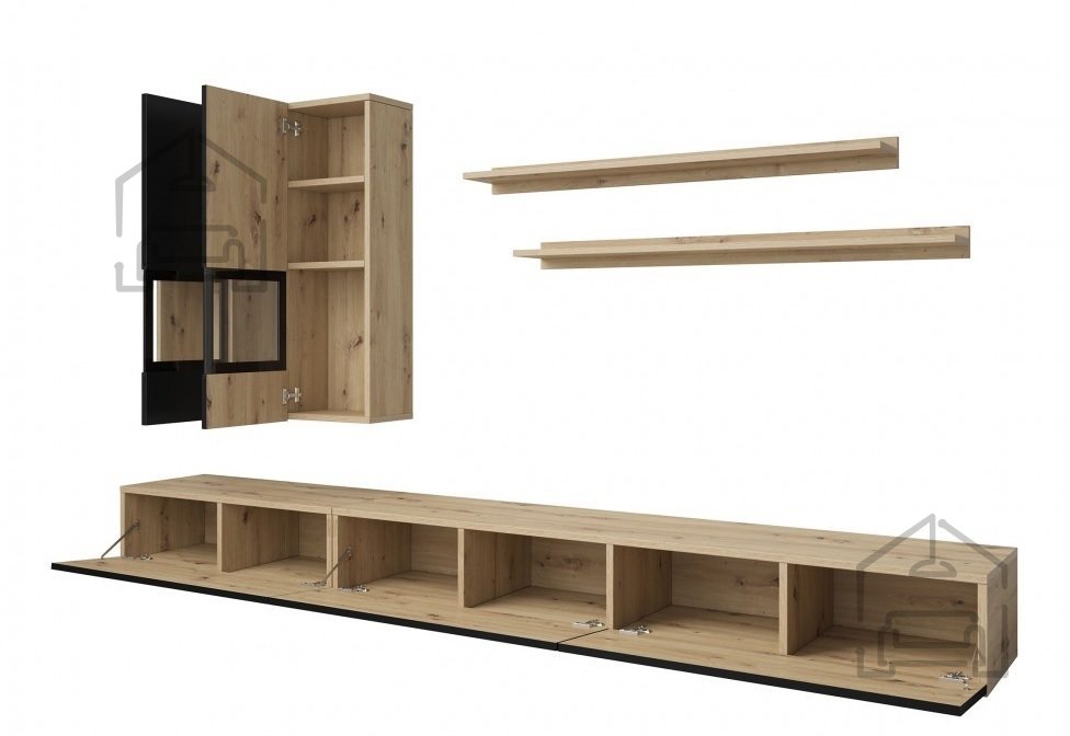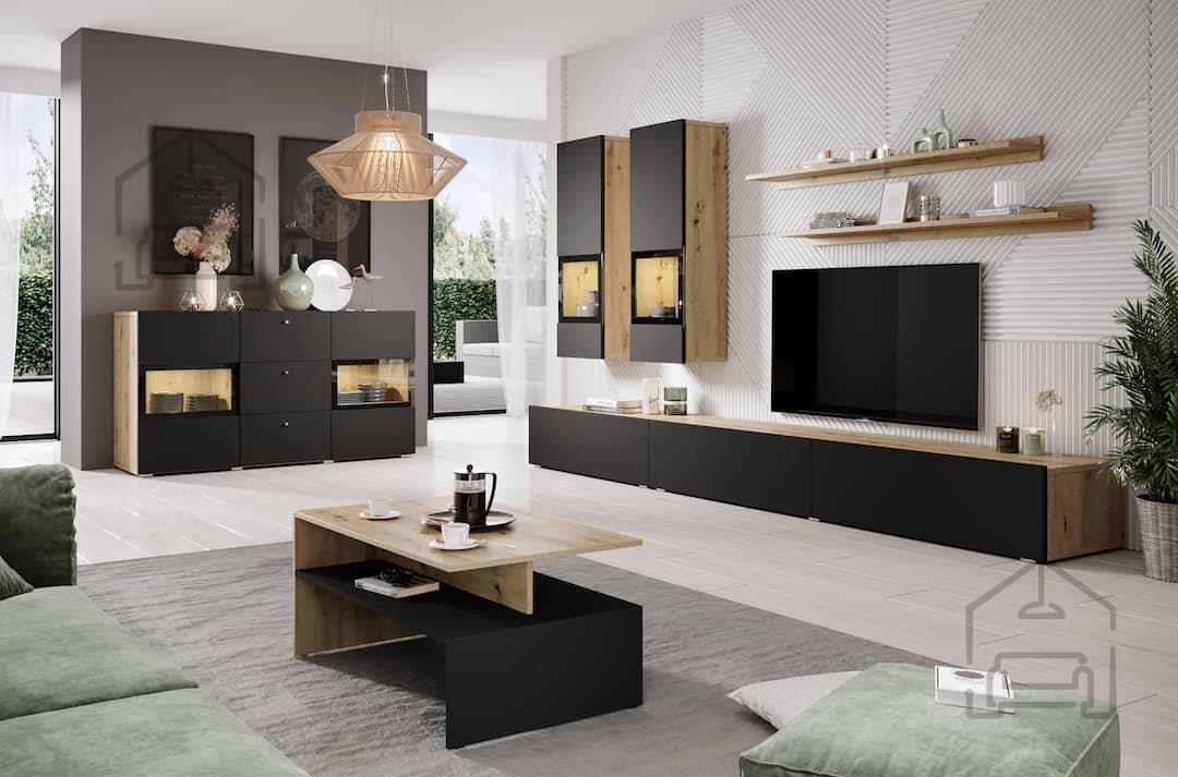 Wir präsentieren Ihnen das außergewöhnliche Wohnwand-Set Baros – Artisan/Schwarz Supermatt, das modernes Design mit hoher Funktionalität vereint. Dieses besondere Ensemble wird schnell zum Mittelpunkt Ihres Wohnzimmers und begeistert sowohl Sie als auch Ihre Gäste. Dank der stilvollen Farbkombination und der hochwertigen Verarbeitung aus Spanplatte ist dieses Möbelstück die perfekte Wahl für jedes moderne Zuhause.