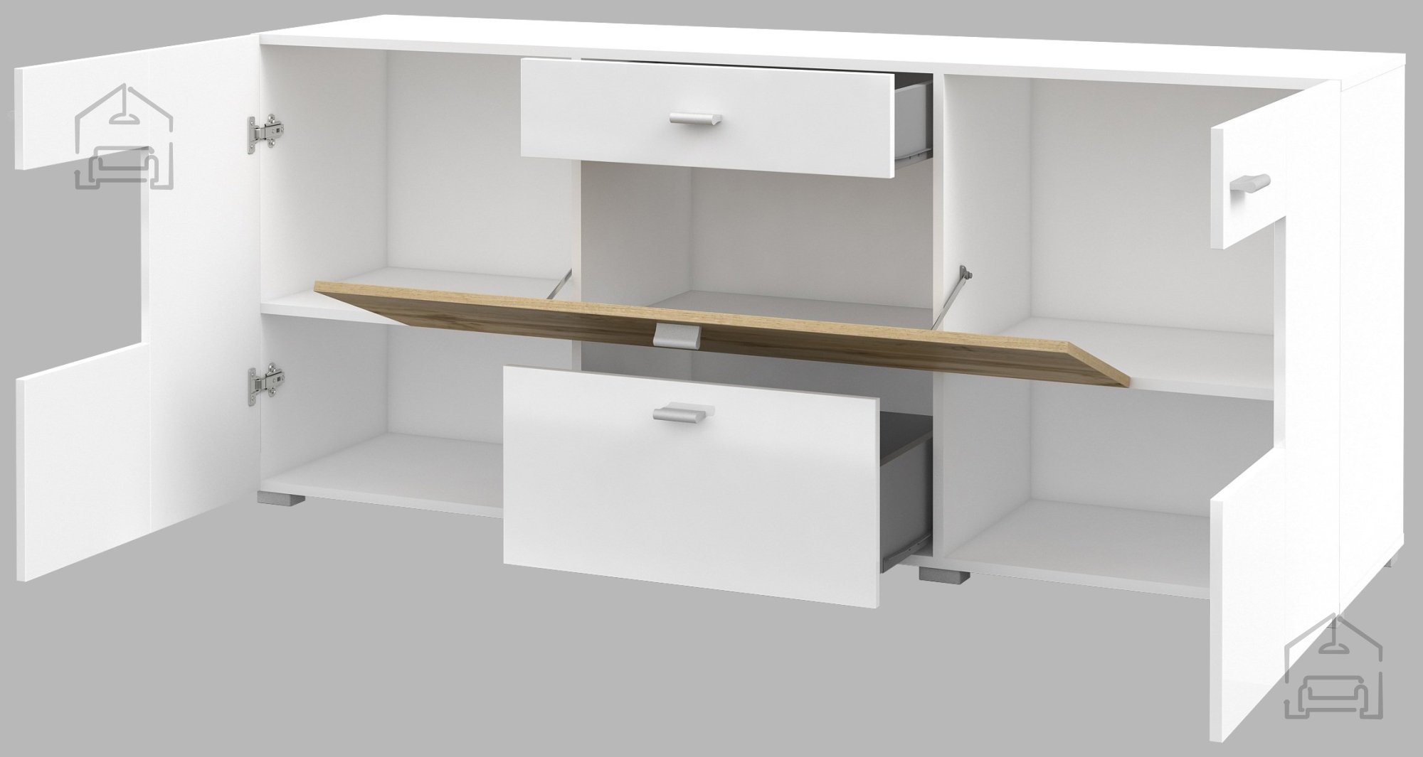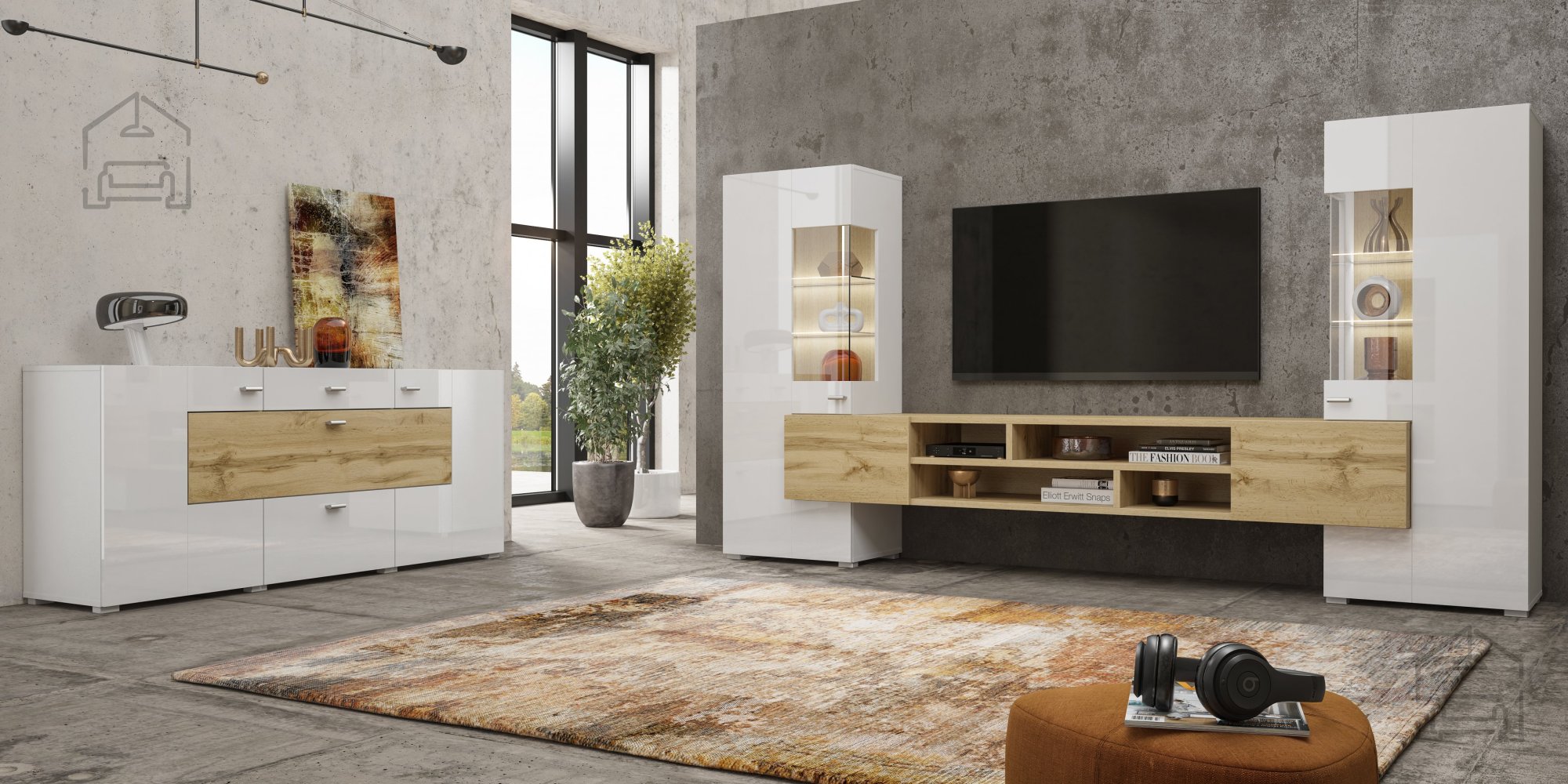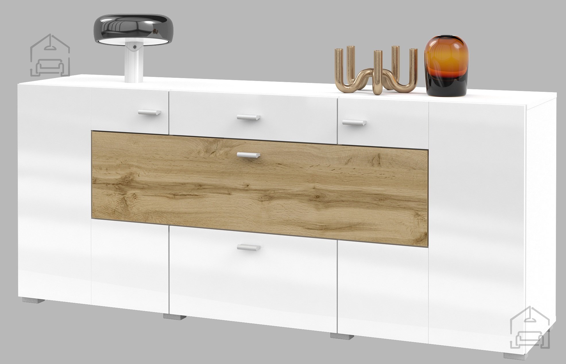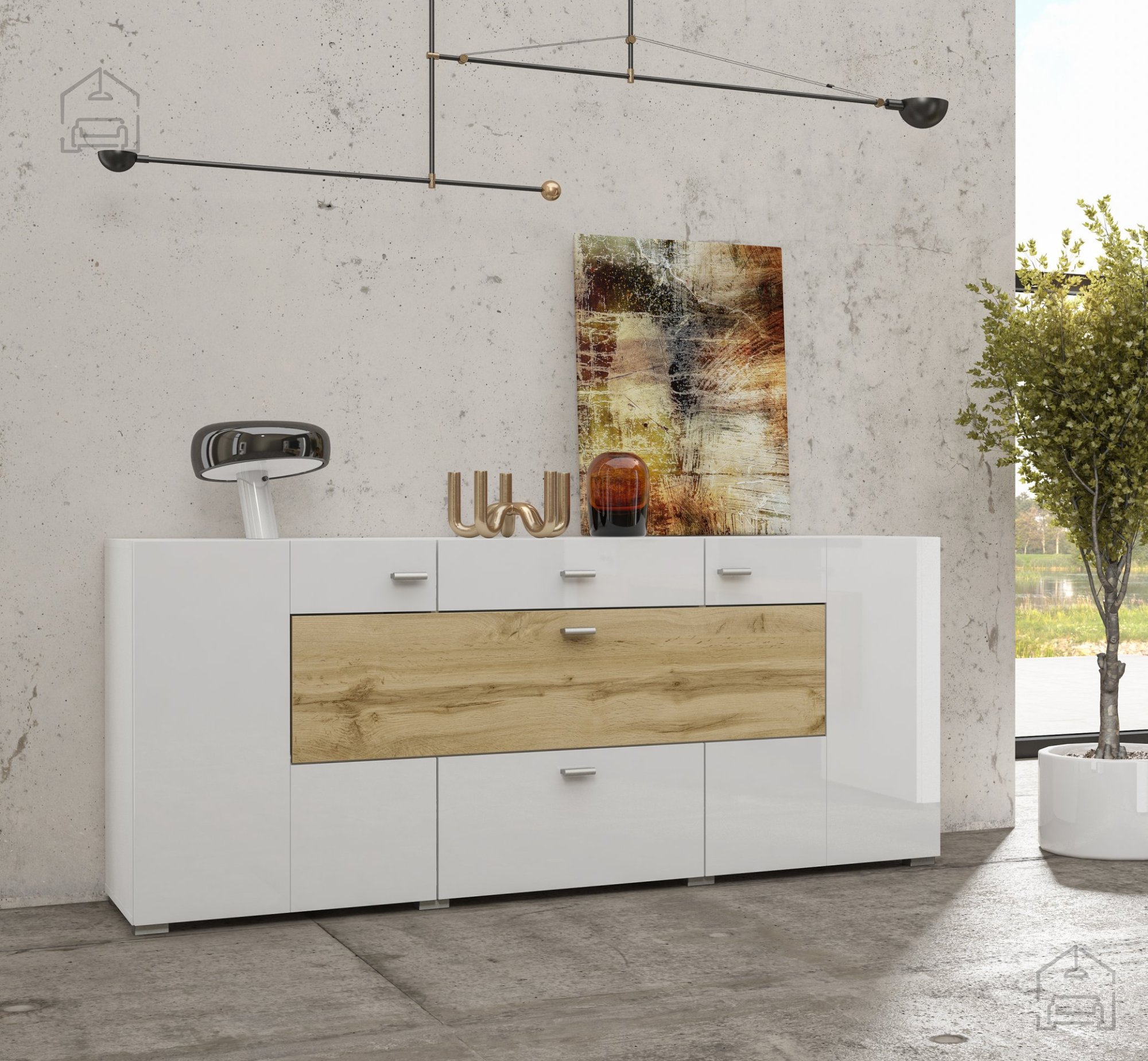 Der Korpus der Kommode ist in Weiß gehalten und mit Details in Wotan Eiche versehen, was jedem Raum eine frische, moderne Note verleiht. Die Front in glänzendem Weiß mit Akzenten aus Wotan Eiche sorgt für einen klaren, eleganten Look und einen ansprechenden Kontrast, der sofort ins Auge fällt.