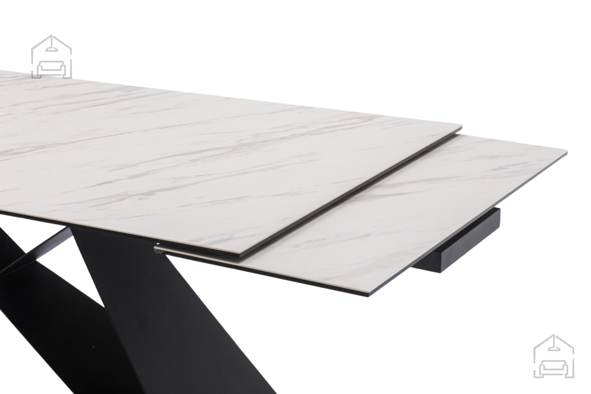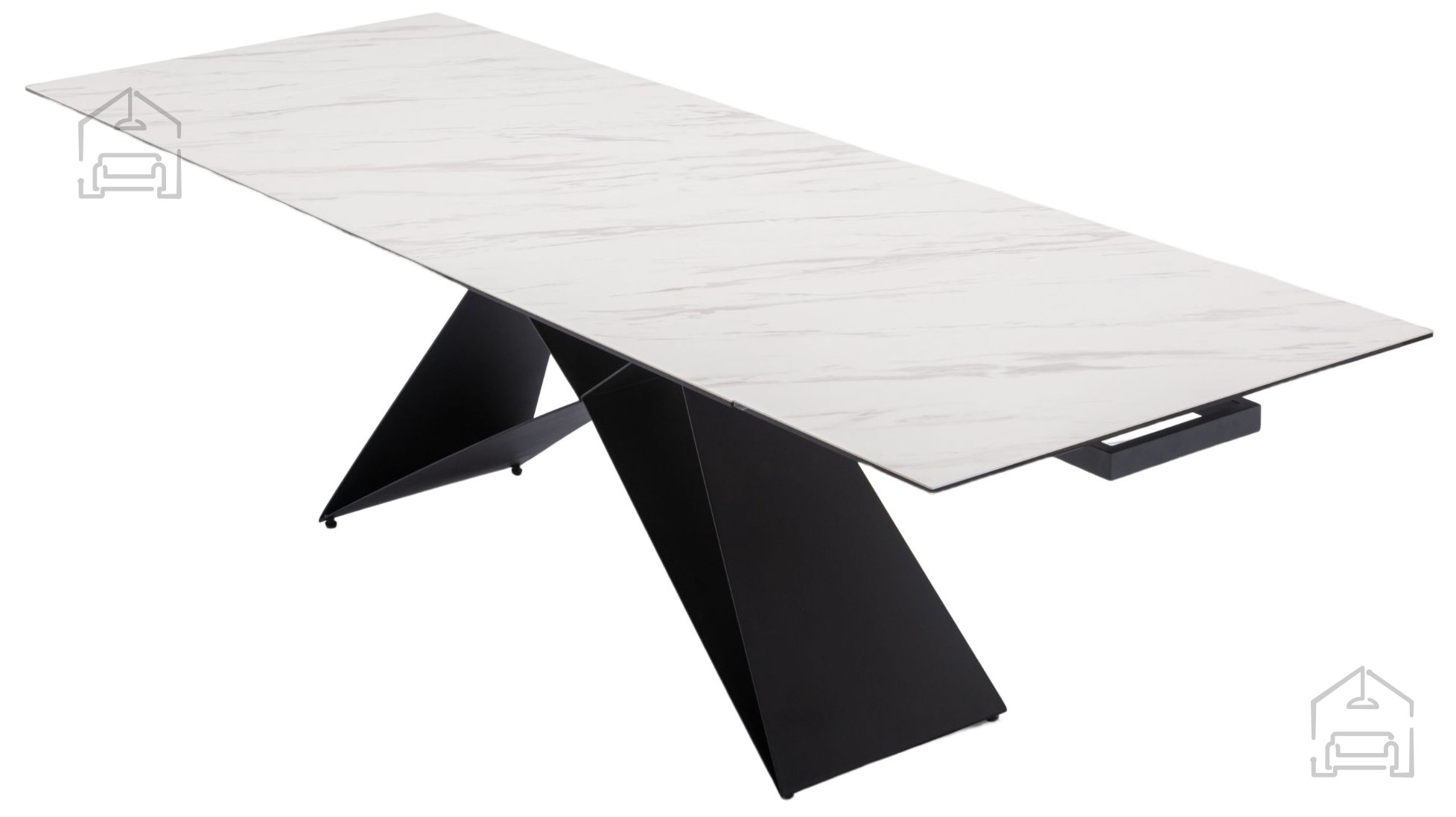 Großer, ausziehbarer Esstisch in rechteckiger Form mit einem Metallgestell in W-Form.