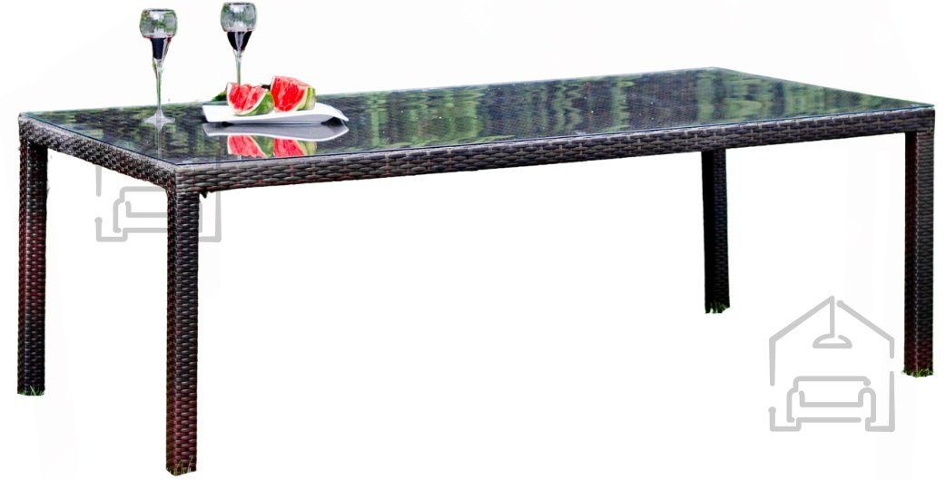 Die Oberfläche ist mit hochwertigem synthetischem Rattan in einer Stärke von 7–8x1,2 mm verflochten. Dieses Material wurde speziell für den Außenbereich entwickelt – es nimmt keine Feuchtigkeit auf, ist UV-beständig und unempfindlich gegenüber Temperaturschwankungen. In Kombination mit der Glasplatte, die auf rutschfesten Auflagen liegt, garantiert der Tisch eine sichere und komfortable Nutzung.