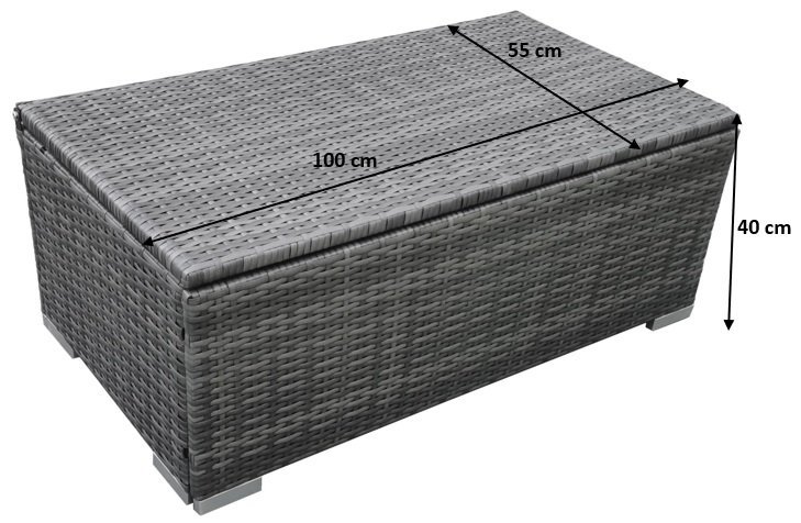 Die Basis der Box bildet eine Aluminiumkonstruktion, die ein optimales Verhältnis zwischen Stabilität und Gewicht bietet. Aluminium rostet nicht und eignet sich daher ideal für den ganzjährigen Einsatz im Freien. Die Oberfläche ist mit Technorattan verflochten – einem synthetischen Rattan mit einer Faserstärke von etwa 7–8 × 1,2 mm. Dieses Material ist speziell entwickelt, um UV-Strahlung, Feuchtigkeit und Temperaturschwankungen standzuhalten. Selbst nach Jahren behält es Form und Farbe, sodass die Box kaum Pflege benötigt. Gelegentliches Abwischen mit einem feuchten Tuch und mildem Reinigungsmittel genügt.