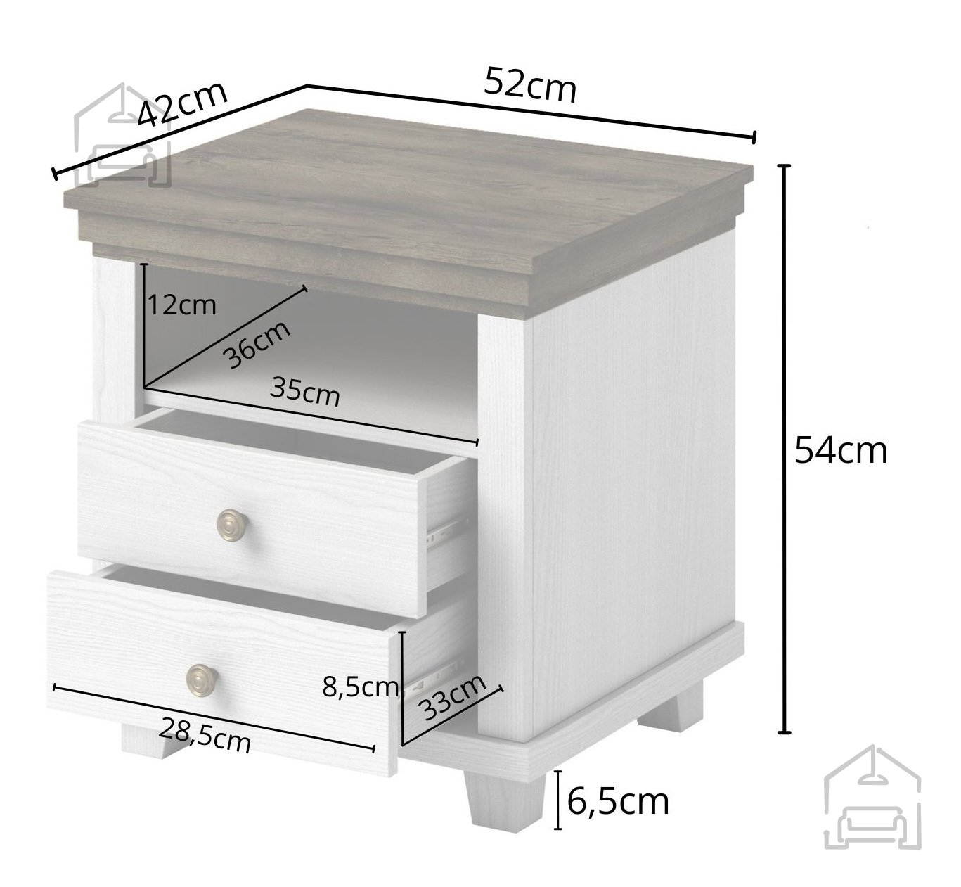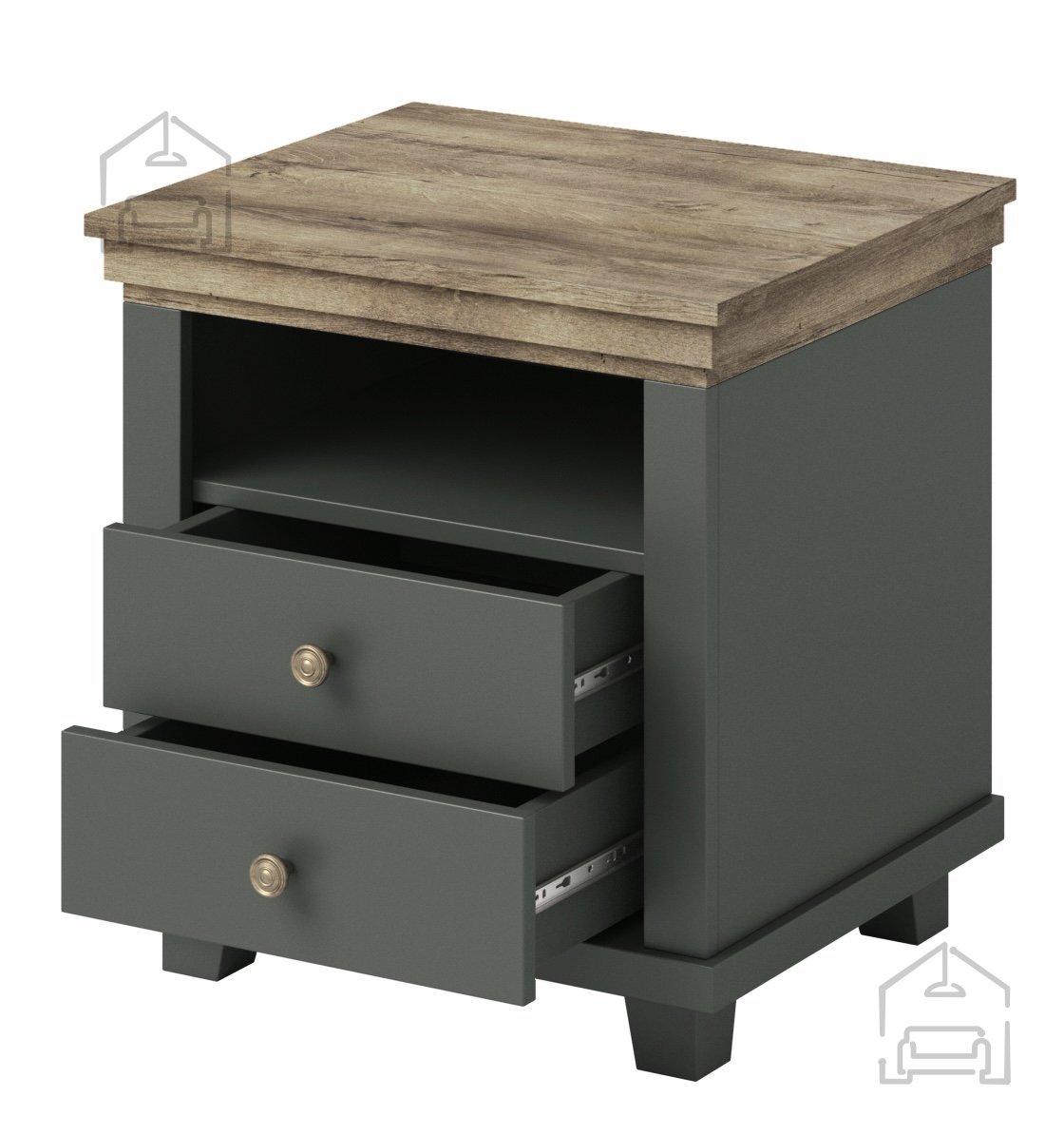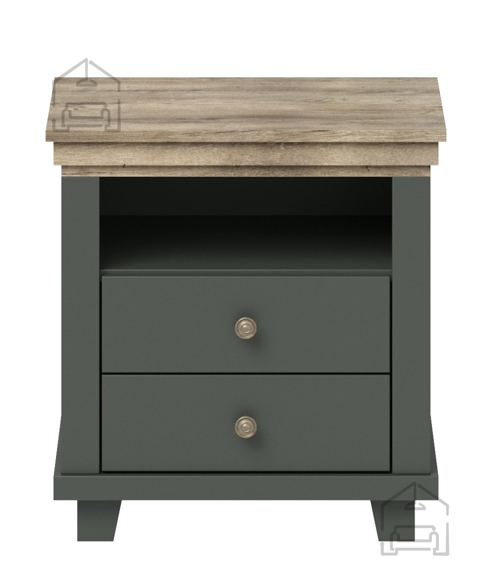 Die Maße des Produkts betragen 52 x 42 x 54 cm – kompakt, aber dennoch geräumig genug, um Ihre wichtigsten Dinge neben dem Bett ordentlich zu verstauen. Gefertigt aus einer laminierten Platte, überzeugt das Kästchen durch Langlebigkeit und Widerstandsfähigkeit gegen Abnutzung. Der grüne Korpus in Kombination mit dem natürlichen Eiche-Lefkas-Dekor schafft eine gemütliche und beruhigende Atmosphäre.