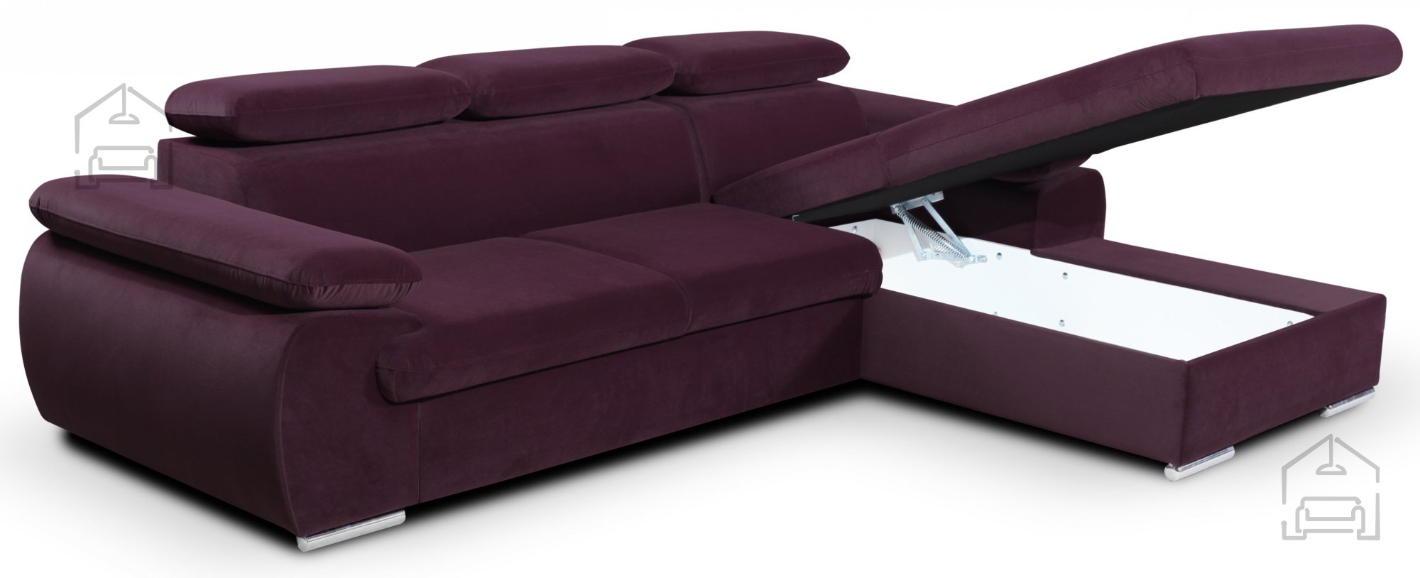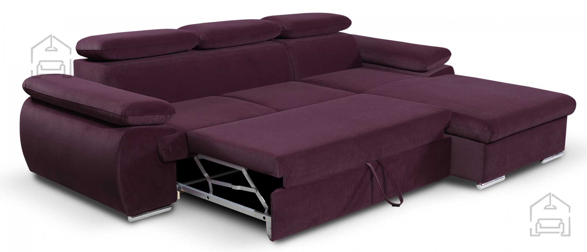 Die Ecksofagarnitur Capri mit ihrer praktischen Delfin-Schlaffunktion ist ideal für ein modernes Wohnzimmer oder ein großzügiges Jugendzimmer. Dank der gepolsterten Rückenlehne kann sie frei im Raum positioniert werden und dient als stilvoller Blickfang. Mit der leicht bedienbaren Ausziehfunktion verwandelt sich das Sofa im Handumdrehen in ein großzügiges, komfortables Bett. Die integrierte Schublade bietet zusätzlichen Stauraum für Bettwäsche und Decken. Verstellbare Kopfstützen sorgen für erhöhten Komfort beim Entspannen und die Garnitur steht sicher auf verchromten Füßen. Die Sitzkissen sind mit Wellenfedern und PUR-Schaum ausgestattet, was den Sitzkomfort erheblich steigert. Ein automatisches System erleichtert das Öffnen der Schlafunktion.