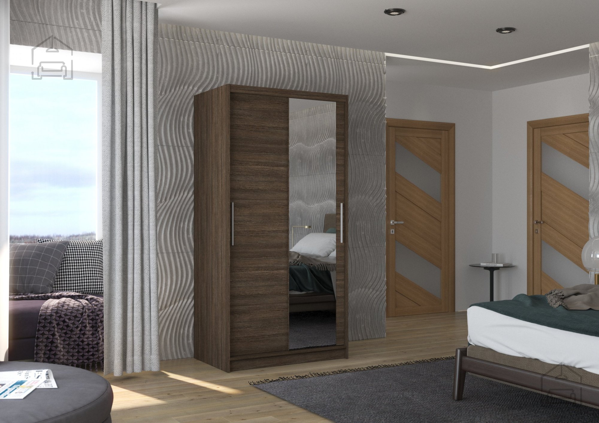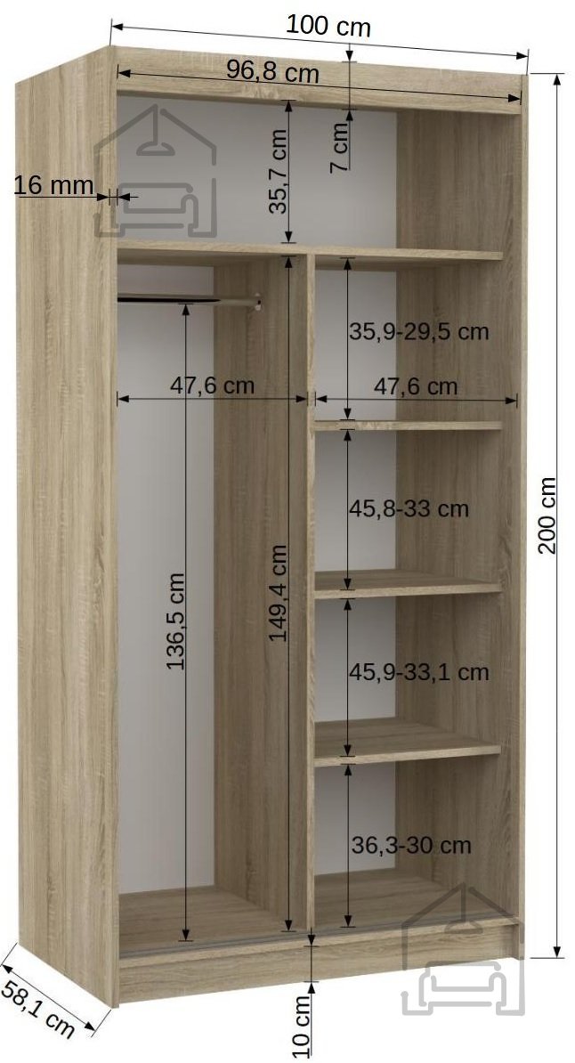 Die ideale Lösung, um Kleidung und Accessoires ordentlich zu verstauen, ist ein funktionaler Kleiderschrank mit Schiebetüren, der modernes Design, praktische Handhabung und hochwertige Verarbeitung vereint. Mit seiner kompakten Breite von 100 cm passt er auch perfekt in kleinere Räume und bietet dennoch ausreichend Stauraum für alles, was Sie im Alltag benötigen. Dank einer Höhe von 200 cm und einer Tiefe von 58 cm bleibt Ihr Garderobenbereich stets ordentlich und übersichtlich.