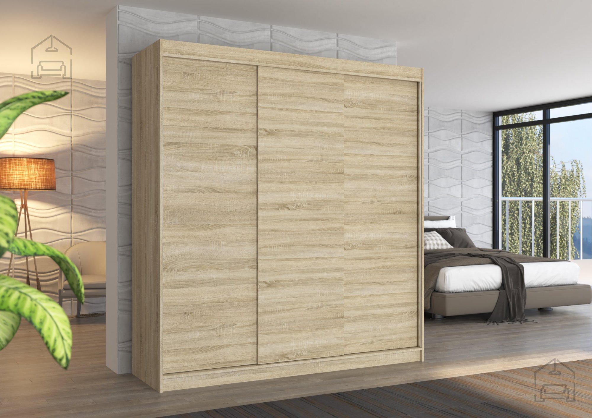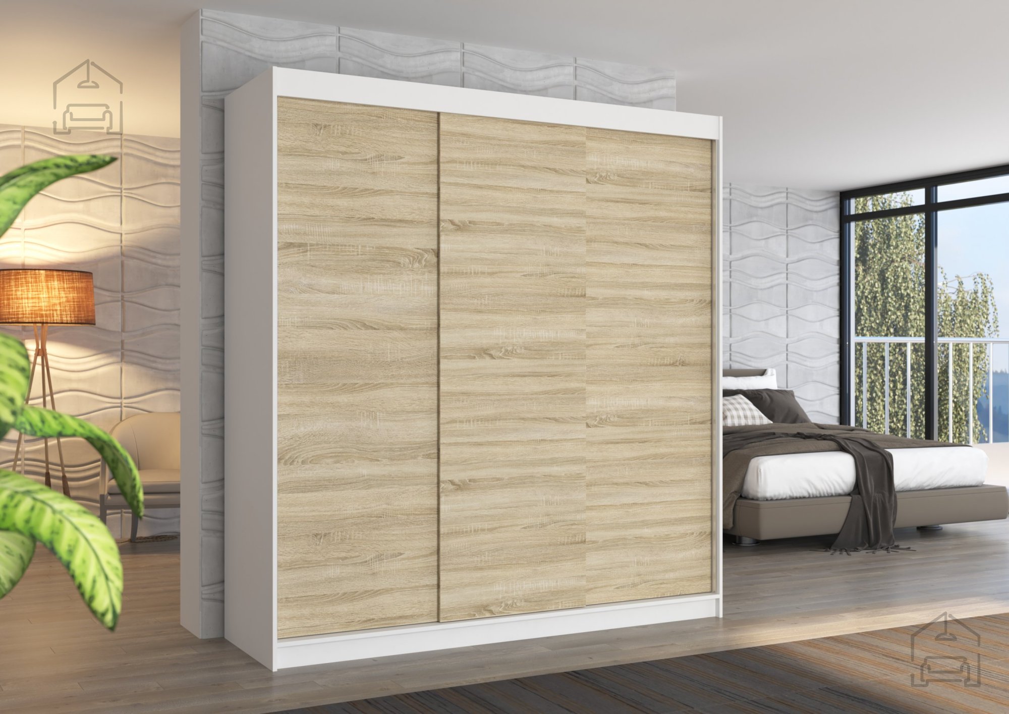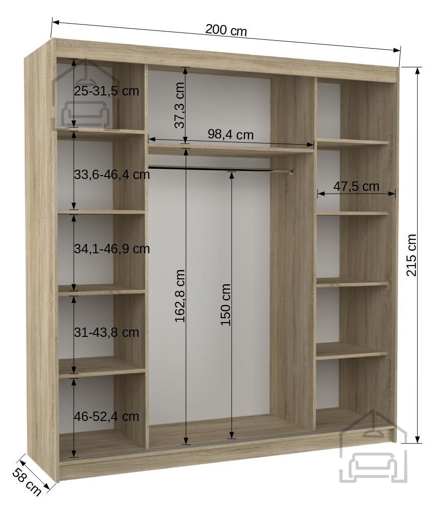 Der elegant gestaltete Kleiderschrank mit Schiebetüren ist die perfekte Wahl für alle, die ihrem Zuhause eine harmonische Kombination aus Funktionalität, modernem Design und großzügigem Stauraum verleihen möchten. Mit seinen Maßen von 200x58x215 cm bietet er reichlich Platz für Kleidung, Schuhe und Accessoires. Dank der Schiebetüren lässt er sich problemlos auch in kleinere Räume integrieren, wo jeder Zentimeter zählt. Durch sein durchdachtes Design eignet sich der Schrank ideal für Schlafzimmer, Vorzimmer oder Ankleideräume und sorgt für eine optimale Organisation Ihrer Sachen.
