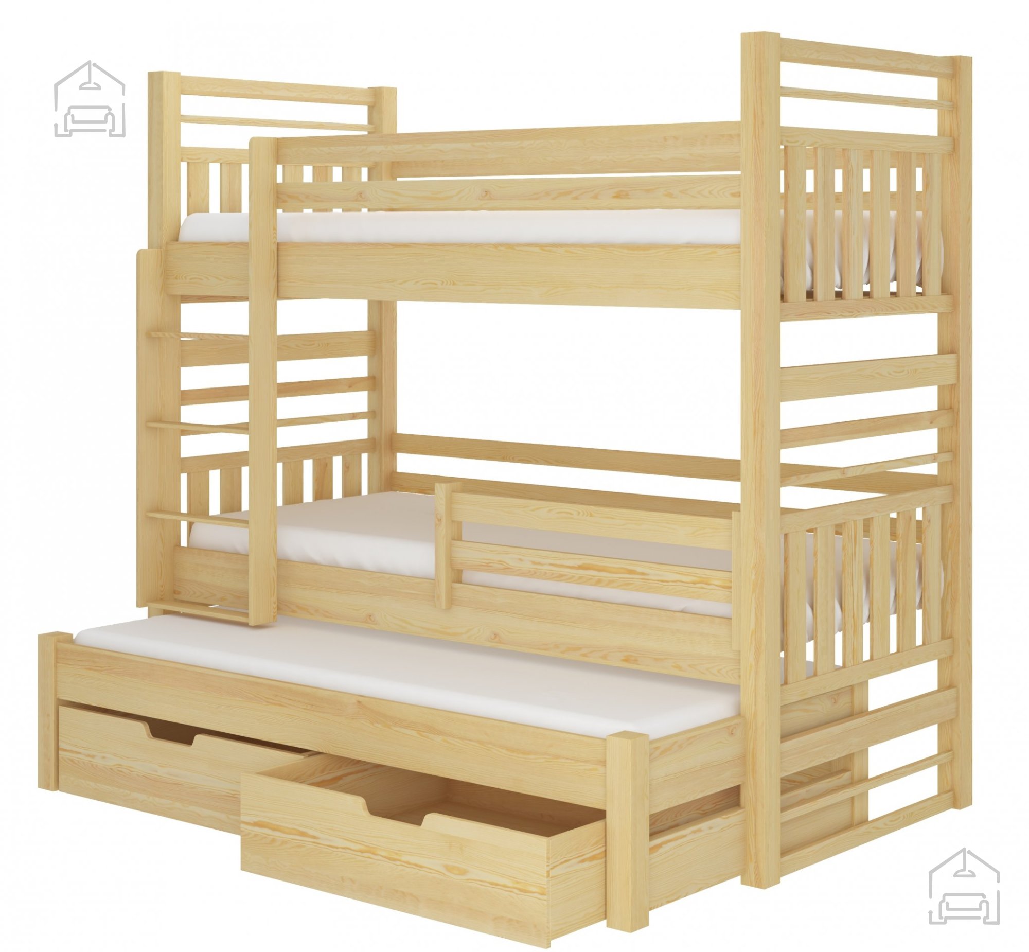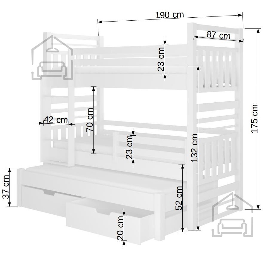 Dieses Etagenbett ist eine ausgezeichnete Lösung für Familien mit mehreren Kindern oder für jene, die oft Freunde und Verwandte zu Besuch haben. Dank der ausziehbaren Zusatzliege können bis zu drei Kinder im selben Zimmer übernachten, ohne dass wertvoller Platz verloren geht. Die Laden unter dem Bett sind besonders praktisch im Alltag und helfen dabei, Ordnung im Zimmer zu halten.