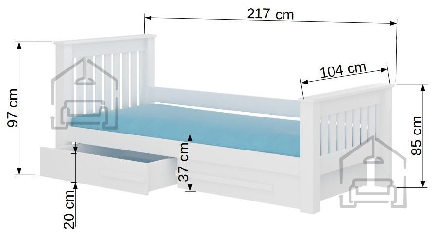Mit den Maßen von 104x217x97 cm bietet das Bett ausreichend Platz für einen erholsamen Schlaf. Die Liegefläche von 90x200 cm entspricht den gängigen Standardmaßen für Kinder- und Jugendbetten. Das Bett überzeugt nicht nur durch Komfort, sondern auch durch seine praktische Seite – der geräumige Bettkasten bietet genügend Stauraum für Decken, Kissen, Bettwäsche oder sogar Spielzeug. So bleibt das Zimmer stets ordentlich, und Sie sparen Platz, den sonst zusätzliche Schränke oder Boxen einnehmen würden.