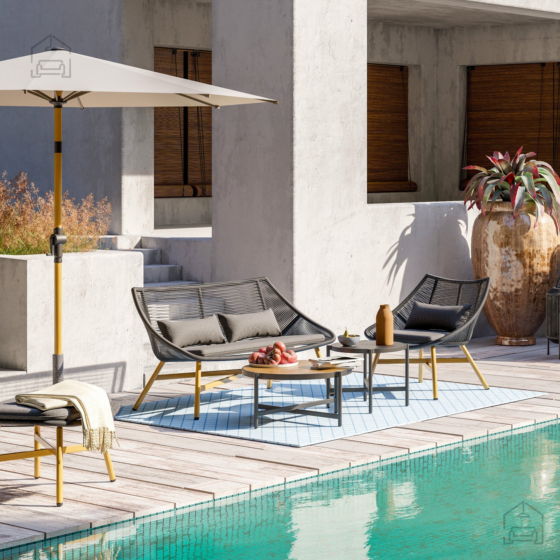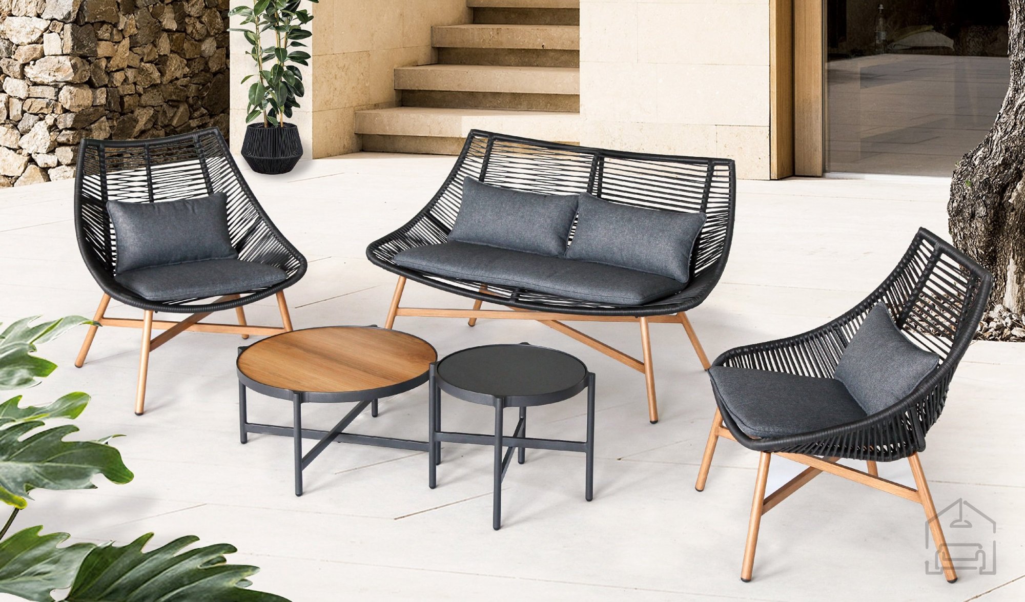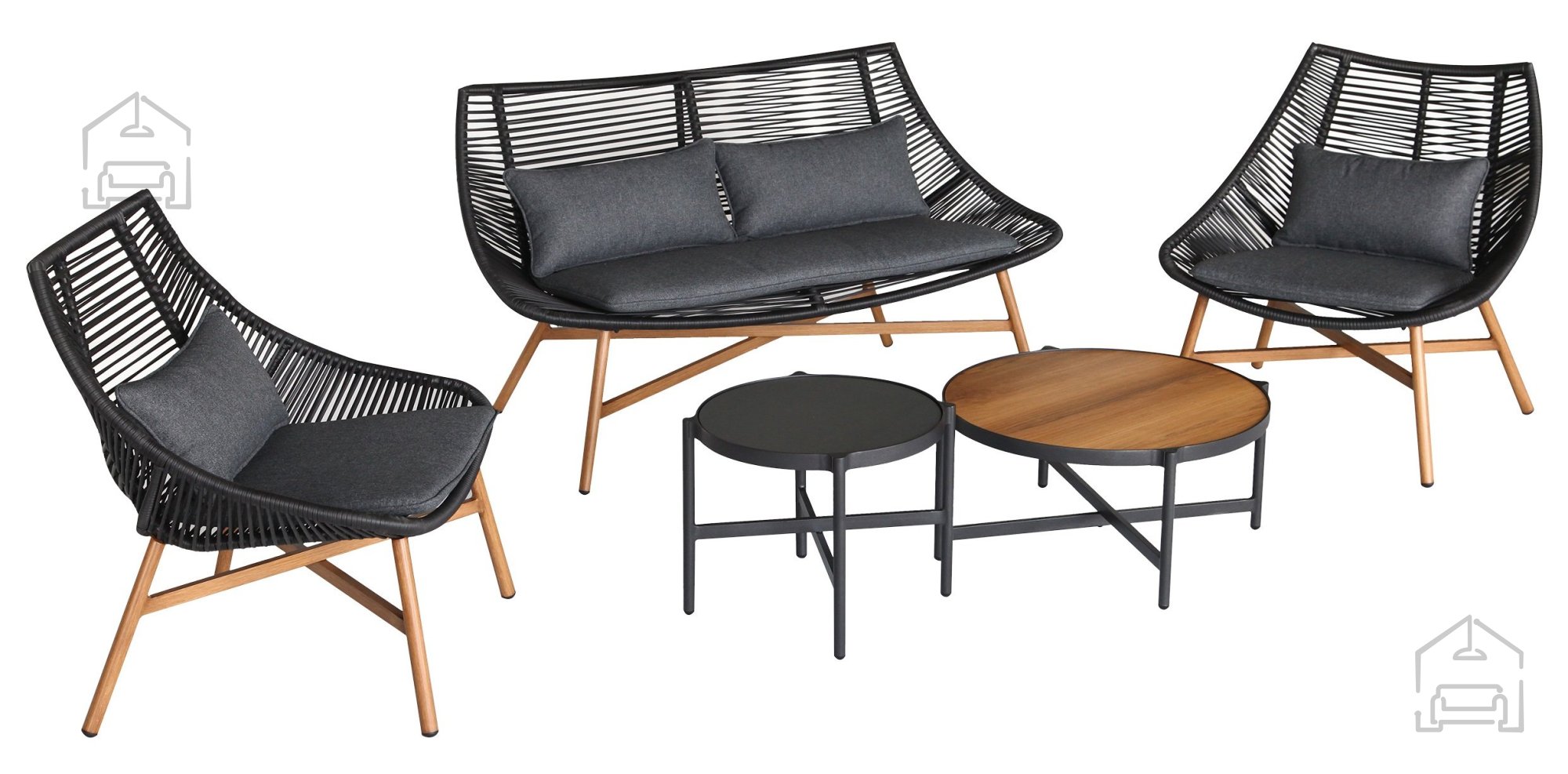 Das Set überzeugt durch ein modernes Design, das perfekt zu aktuellen Outdoor-Trends passt. Die Kombination aus Schwarz, Graphit und Naturtönen wirkt elegant und zugleich zeitlos. Die Möbel lassen sich sowohl im Garten oder auf der Terrasse als auch im Innenbereich verwenden. Passende Überdachungen, Liegen oder andere stilvolle Accessoires können das Ensemble ideal ergänzen.