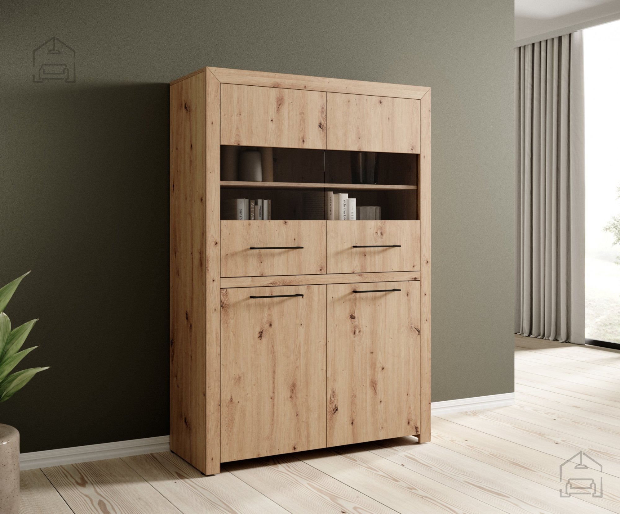 Die Vitrine besteht aus einer 16 mm starken laminierten Platte, die für Langlebigkeit und Widerstandsfähigkeit im Alltag sorgt. Ihre Oberfläche in der Farbe Eiche Artisan verleiht ihr eine natürliche Optik, die sich harmonisch in unterschiedliche Einrichtungsstile einfügt.