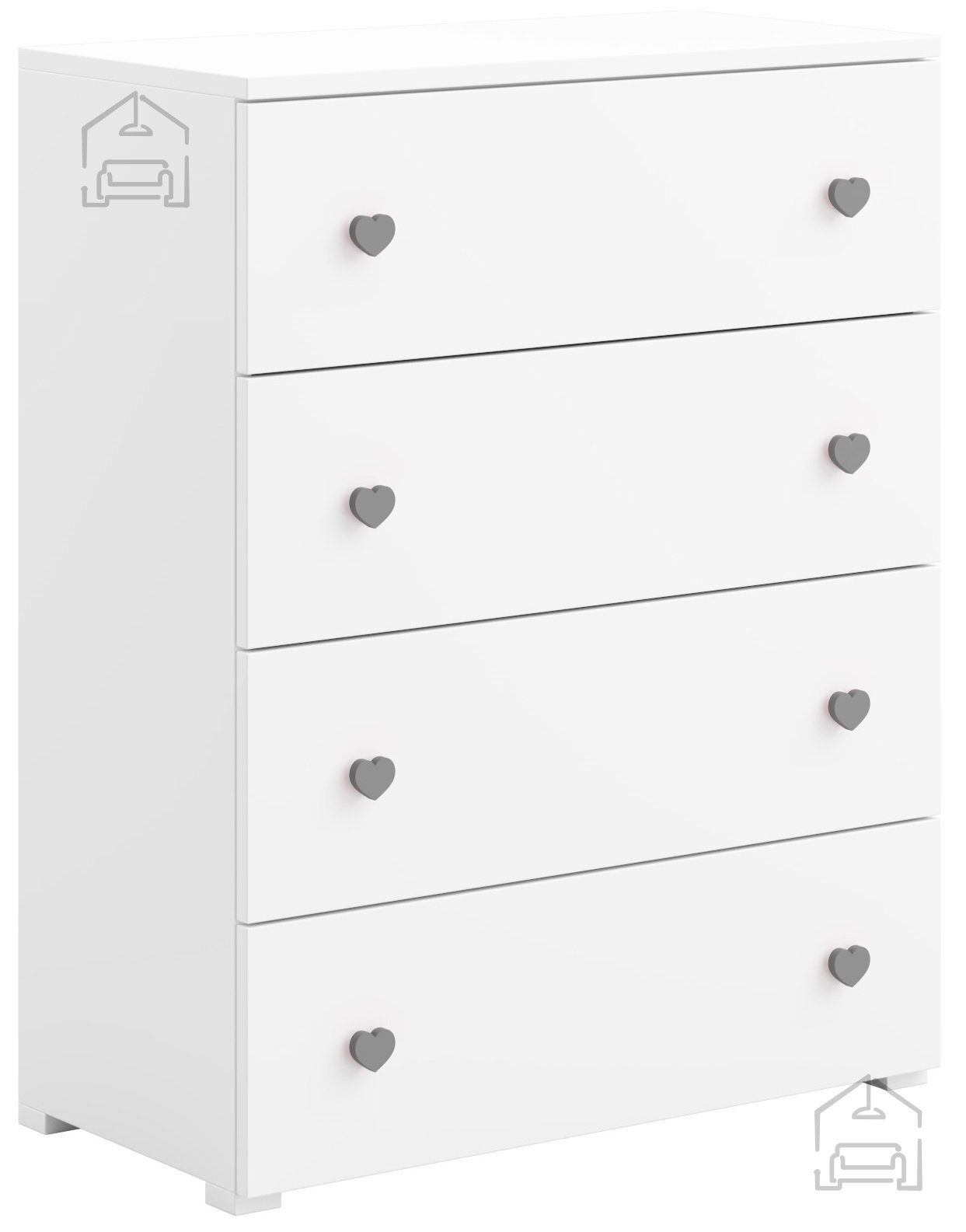 Mit den Maßen von 80x40x102 cm passt sich die Kommode mühelos kleineren wie auch größeren Räumen an. Die geräumigen, praktischen Laden bieten ausreichend Platz für Kleidung, Spielzeug, Bücher oder Schulsachen. Die sanft weiße Oberfläche mit grauen Details macht dieses Möbelstück nicht nur funktional, sondern auch optisch ansprechend. Die charmanten Herzgriffe verleihen ihm eine verspielte Note, die sowohl Kinder als auch Eltern begeistert.