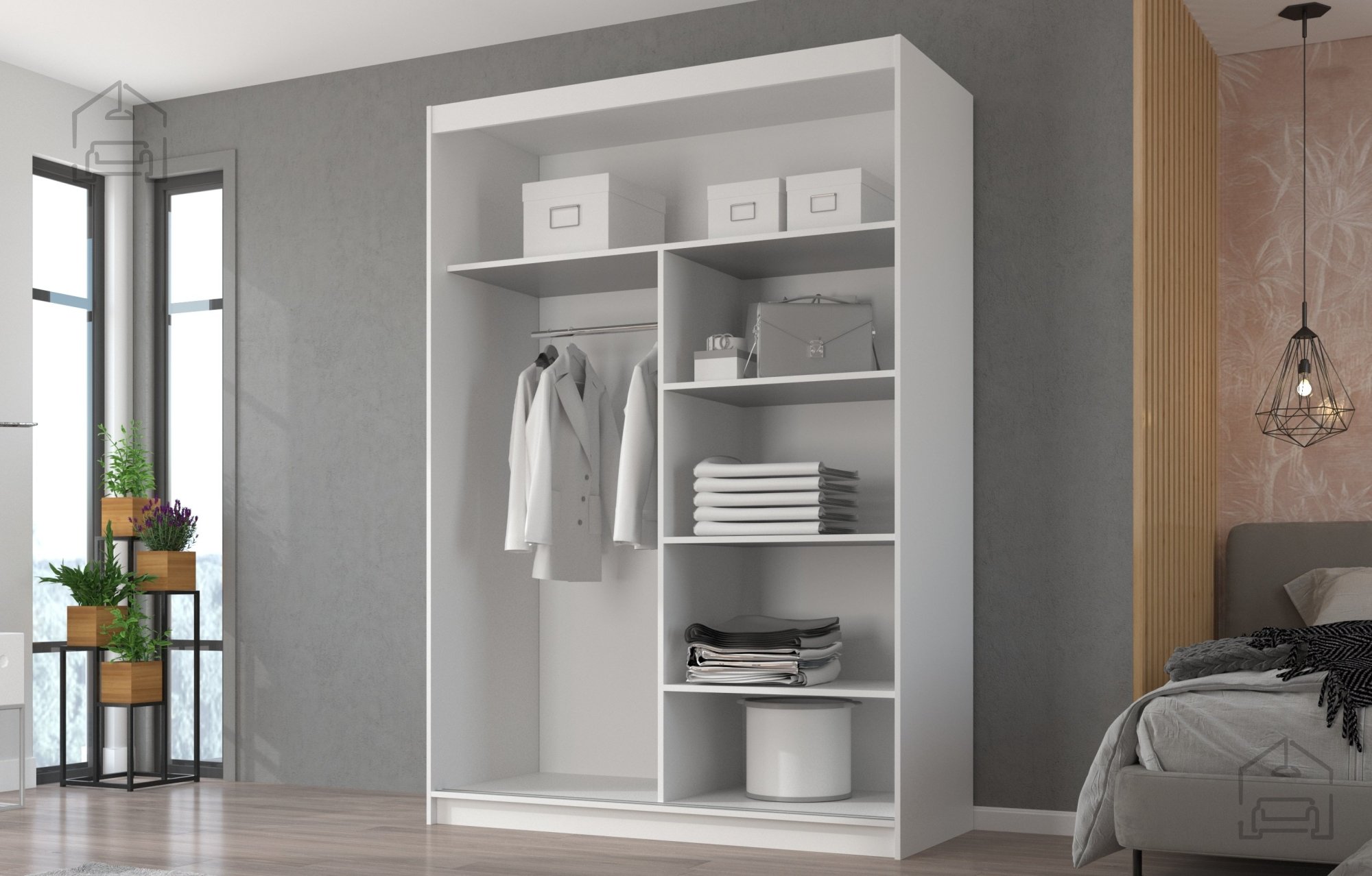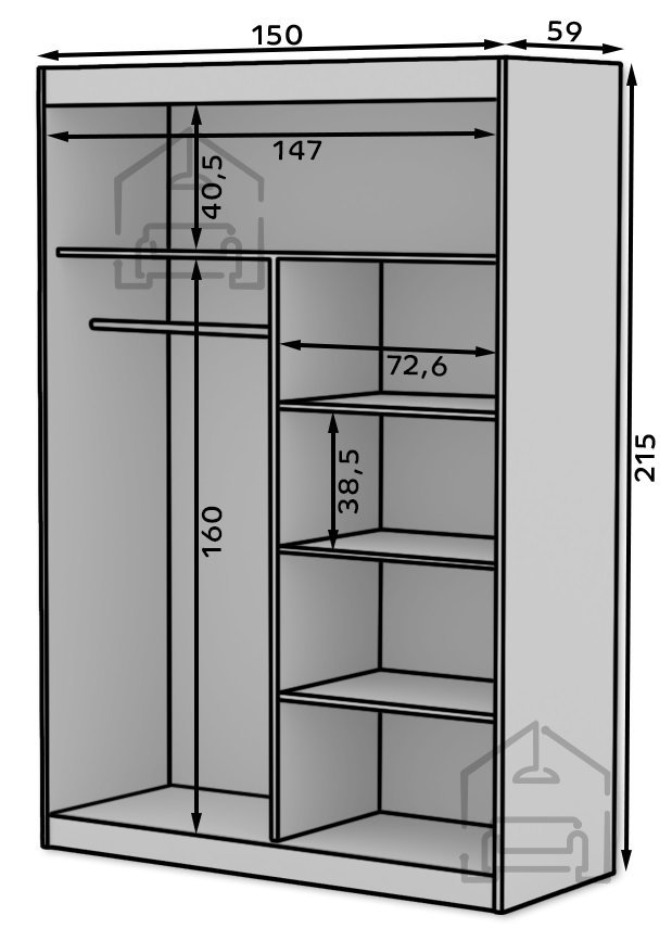 Die Maße von 150x59x215 cm sind so gewählt, dass der Schrank viel Platz zum Verstauen bietet, ohne den Raum zu überladen. Im Inneren erwartet Sie eine durchdachte Aufteilung mit Fächern und einer Kleiderstange, damit Kleidung, Schuhe und Accessoires ordentlich und griffbereit bleiben. Großzügige Ablagen bieten genug Platz für gefaltete Kleidung, Boxen oder Bettwäsche, während die Kleiderstange dafür sorgt, dass Hemden, Kleider und Mäntel faltenfrei hängen.