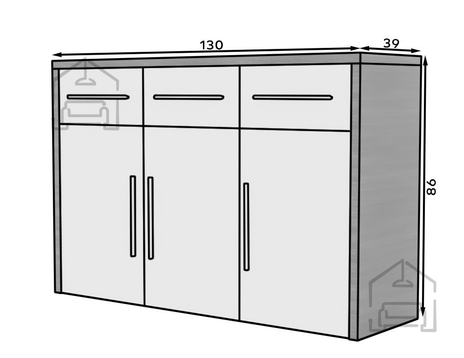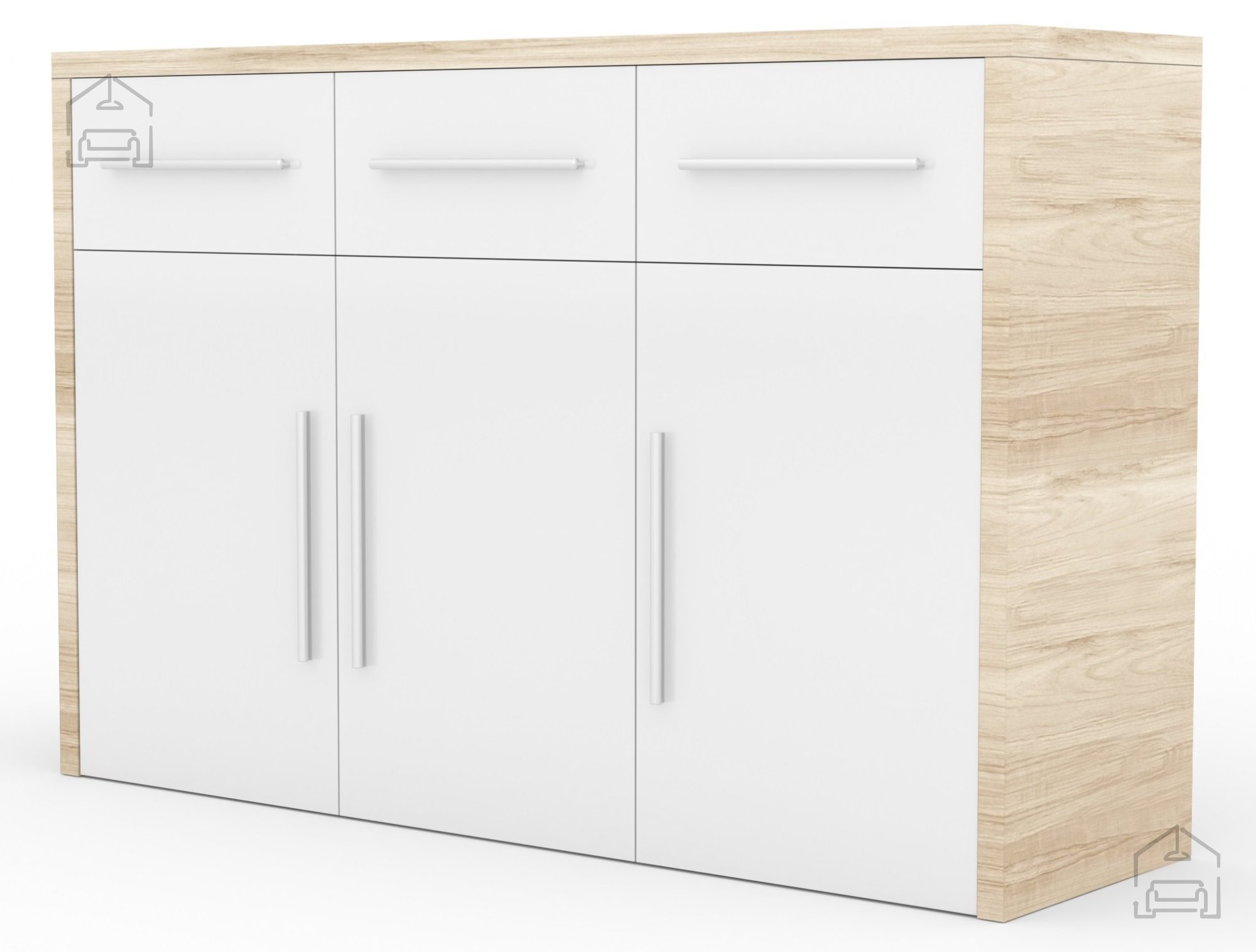 Die Kommode besteht aus einer hochwertigen laminierten Platte mit 16 mm Stärke, die Robustheit und einfache Pflege garantiert. Die glänzende Oberfläche bringt Helligkeit und ein Gefühl von Weite in den Raum, während die Details in Sonoma-Eiche für eine gemütliche Atmosphäre sorgen. Drei praktische Fächer mit Türen und Einlegeböden ermöglichen eine übersichtliche Aufbewahrung von Kleidung, Dokumenten, Geschirr oder anderen Dingen, die Sie gerne griffbereit, aber nicht sichtbar haben möchten.