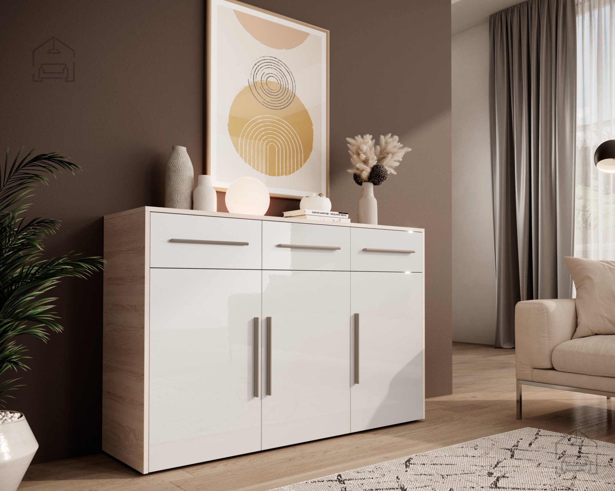 Wenn Sie Möbel suchen, die praktisch, modern und zugleich elegant sind, ist diese Kommode die perfekte Wahl. Sie verbindet Funktionalität mit zeitloser Ästhetik. Die geschmackvolle Kombination aus weißem Hochglanz und warmem Sonoma-Eichen-Dekor passt wunderbar zu verschiedensten Einrichtungsstilen – von minimalistisch bis klassisch. Mit den Maßen 130x39x86 cm bietet sie ausreichend Stauraum und bleibt dennoch kompakt genug, um auch in kleinere Räume zu passen.