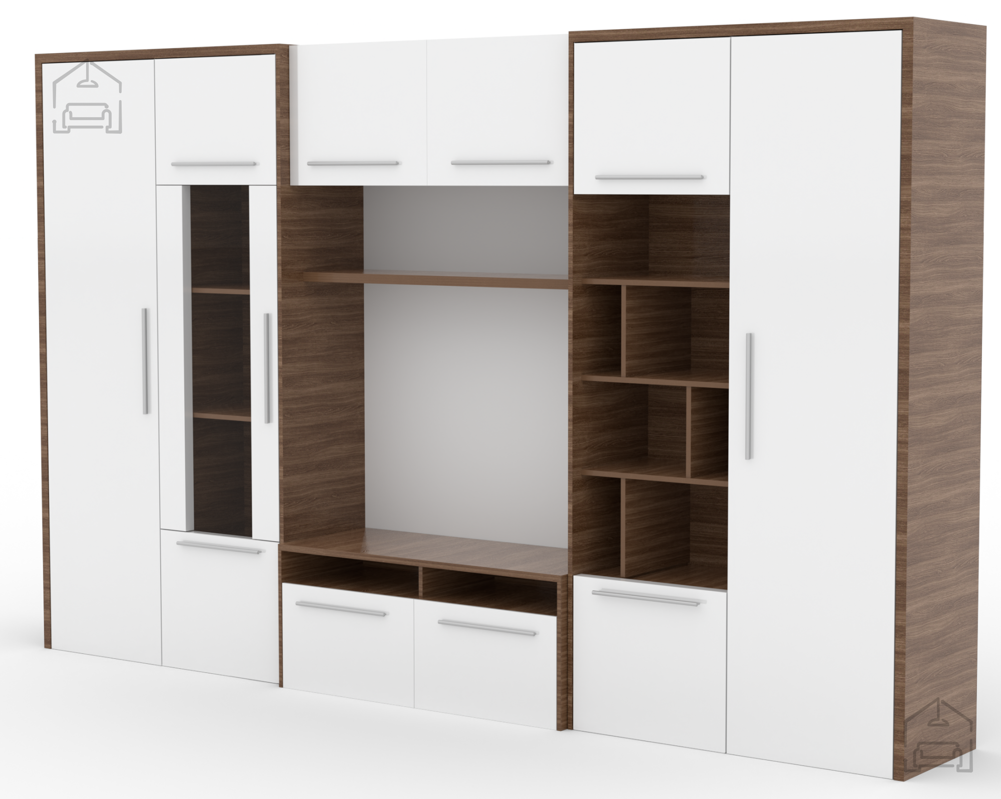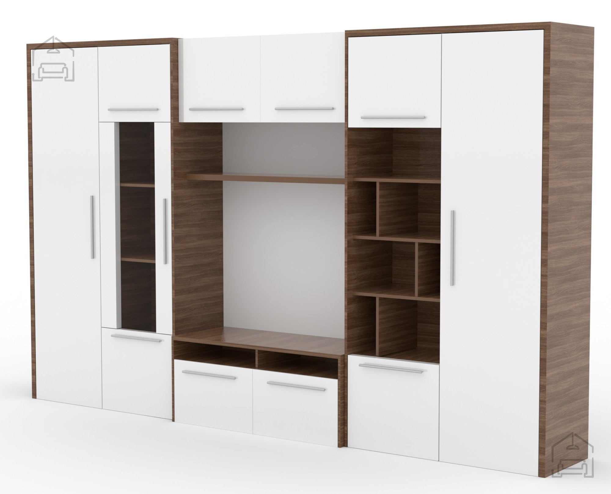 Die Wohnwand Mario des Herstellers ADRK vereint modernes Design, großzügigen Stauraum und praktische Funktionalität in einem eleganten Möbelstück. Sie besteht aus einer hochwertigen, 16 mm starken laminierten Platte, die Stabilität und Langlebigkeit bietet und zugleich pflegeleicht ist. Die Kombination aus Weiß und Braun schafft einen harmonischen Kontrast, der sowohl in helle als auch dunklere Wohnräume passt. Mit einer Breite von 320 cm, einer Höhe von 200 cm und einer Tiefe von 45 cm bietet Mario reichlich Platz zum Verstauen, Dekorieren oder für Multimedia-Geräte – ideal für moderne Wohnzimmer, in denen Stil und Alltagstauglichkeit Hand in Hand gehen.