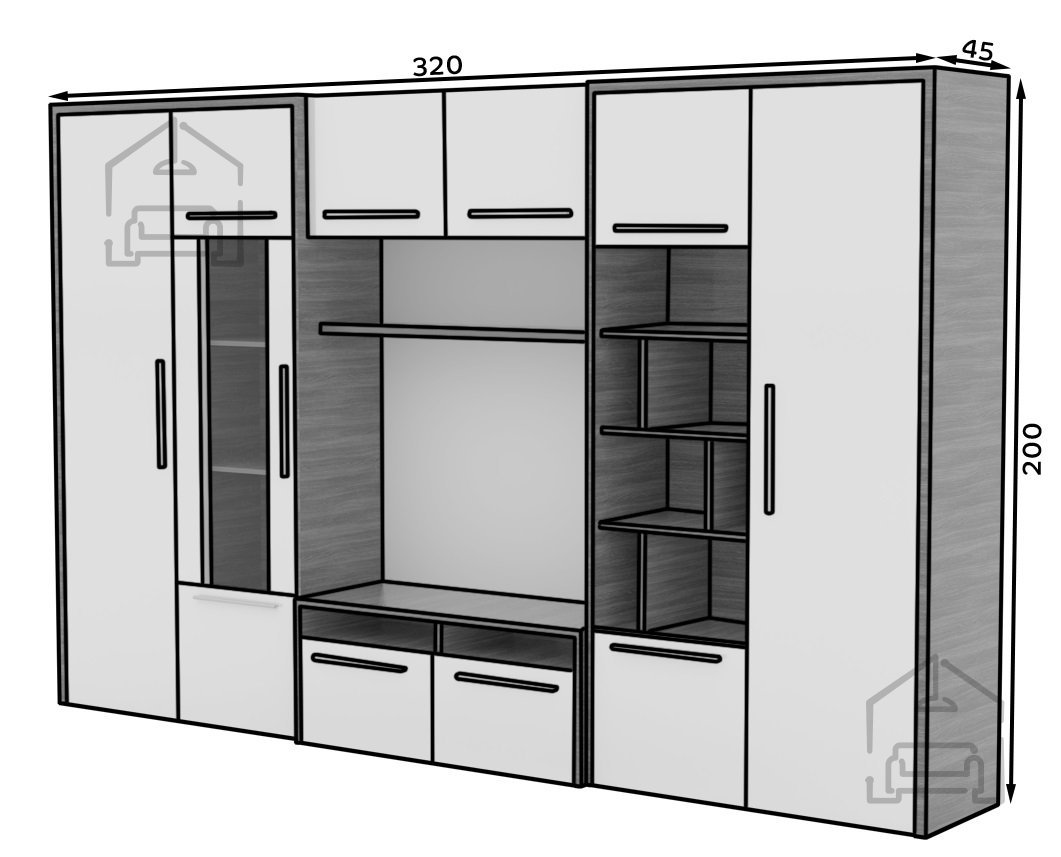 Mit ihren beeindruckenden Maßen von 320 × 45 × 200 cm bietet die Wohnwand Mario besonders viel Platz für verschiedenste Gegenstände. Die oberen Bereiche eignen sich ideal zur Präsentation von Dekorationen, Büchern oder Familienfotos, während die geschlossenen Fächer unten Stauraum für Dokumente, Elektronik und andere Utensilien schaffen. Der mittlere Bereich kann als Platz für den Fernseher oder Multimedia-Geräte genutzt werden – so wird Mario zum Mittelpunkt des Wohnzimmers. Dank der durchdachten Anordnung von Regalen und Laden bleibt alles übersichtlich und ordentlich, ohne dass der Raum überladen wirkt.