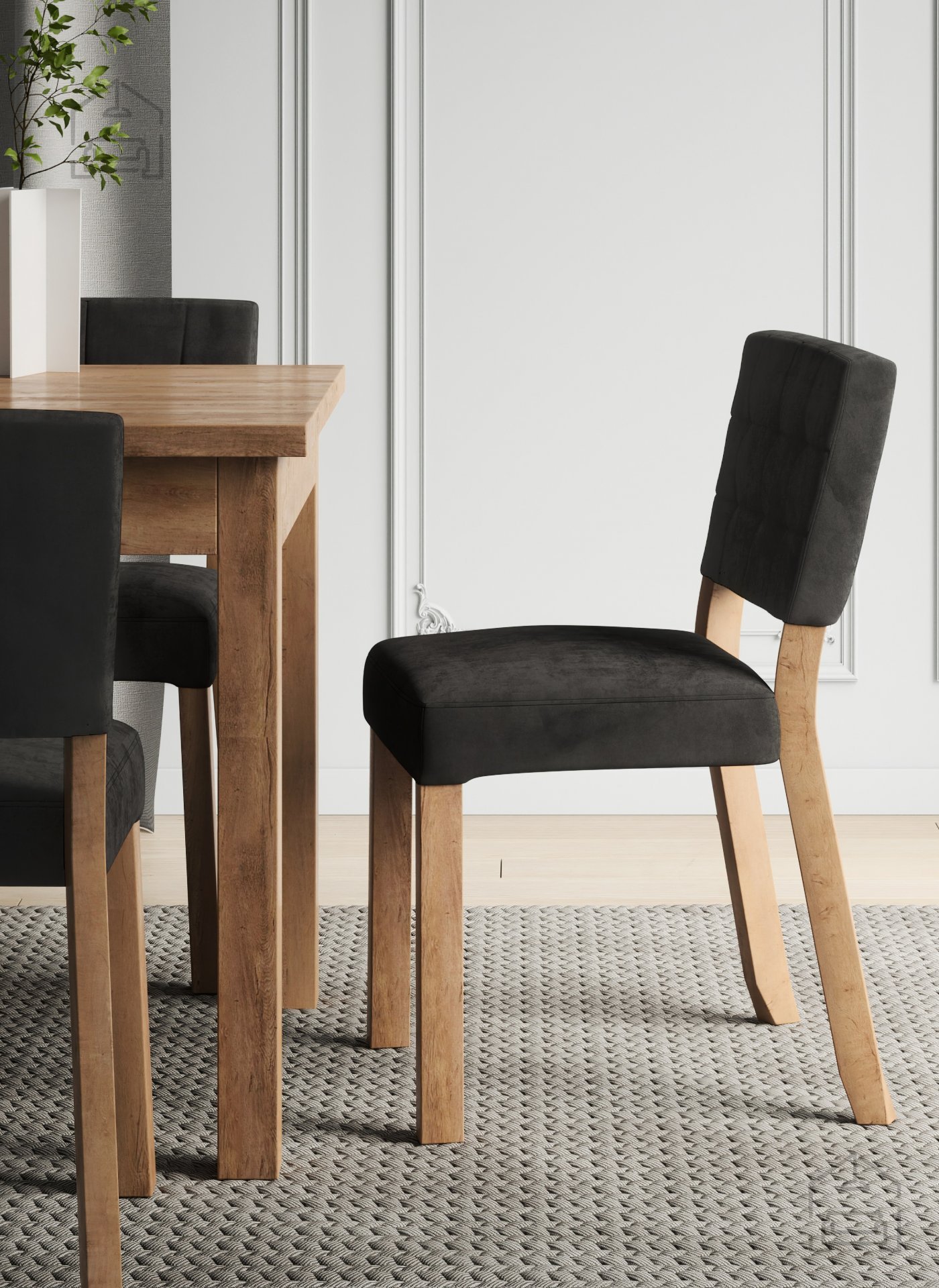 Das Gestell des Stuhls besteht aus Buchenholz, was für Stabilität und Langlebigkeit sorgt. Der MDF-Rahmen und die hochwertige Fertigung im Werk ADRK in Polen garantieren eine lange Lebensdauer. Die Beine haben eine Stärke von 4,5 cm, was zur Stabilität beiträgt und den Stuhl über viele Jahre hinweg zuverlässig nutzbar macht.