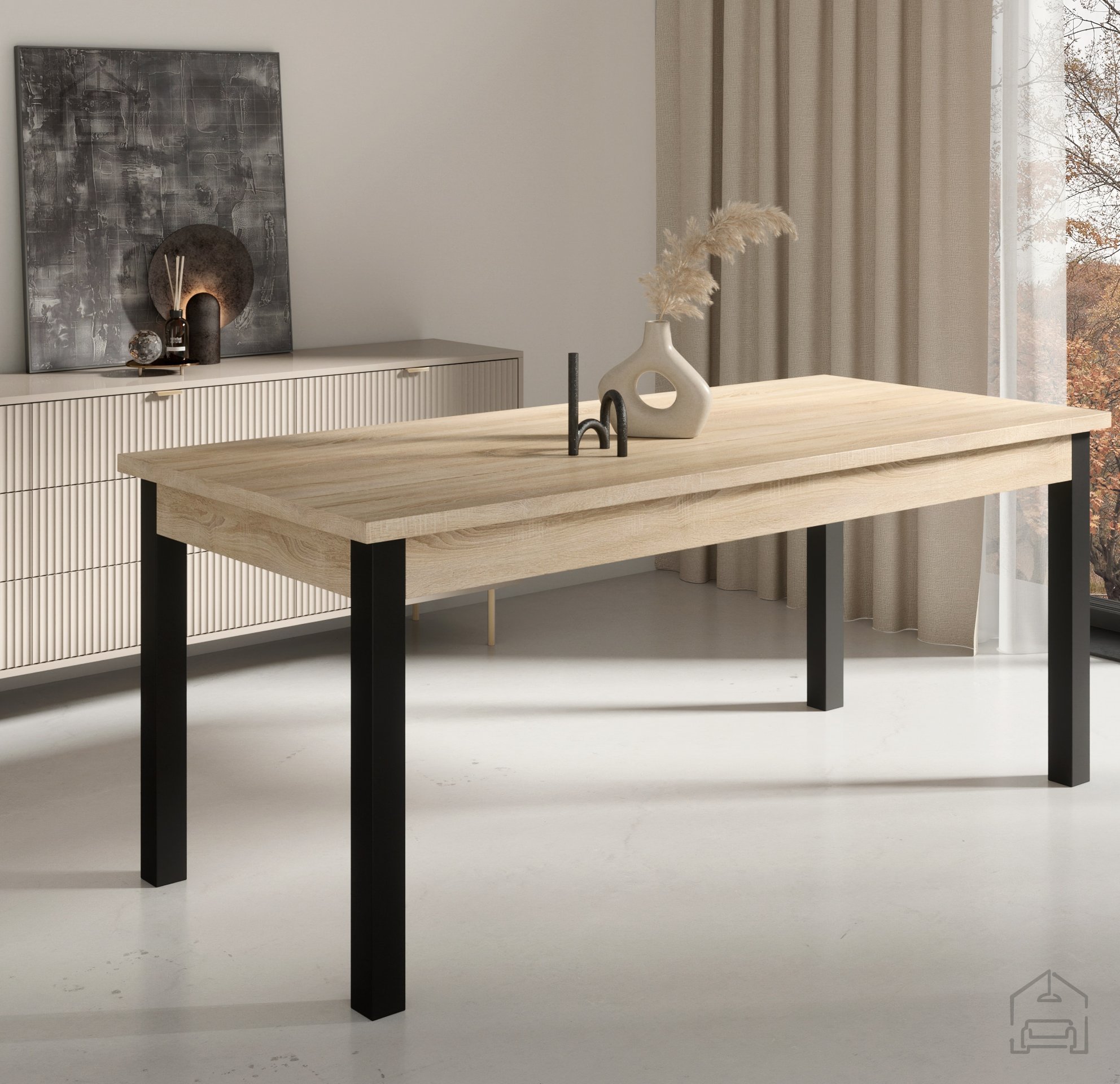 Die warme Farbe der Sonoma-Eiche schafft eine einladende Atmosphäre, die zum Verweilen einlädt, während die schwarzen Beine einen Hauch moderner Eleganz hinzufügen. Dank seines universellen Designs passt das Set sowohl in kleinere Wohnungen als auch in größere Esszimmer und lässt sich leicht mit verschiedenen Deko-Elementen kombinieren – von Metallakzenten bis zu weichen Textilien.
