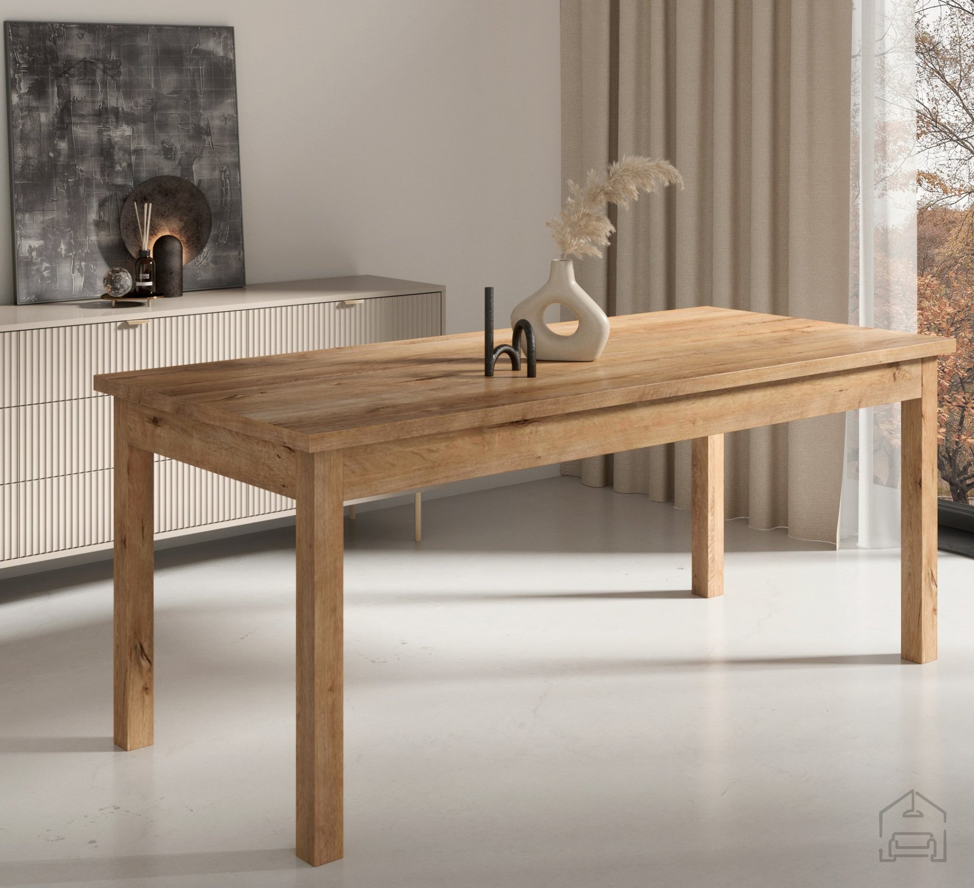 Der Tisch besteht aus robustem MDF-Material mit einem Rahmen aus Buchenholz, was für Stabilität und Langlebigkeit sorgt. Die Oberfläche in Eiche Lefkas verleiht dem Raum eine warme, wohnliche Atmosphäre und lässt sich leicht mit unterschiedlichen Einrichtungsstilen kombinieren – von klassisch bis modern. Der natürliche Holzlook bringt Authentizität und Behaglichkeit in Ihr Esszimmer – jenen Ort, an dem Familie und Freunde gemeinsam Zeit verbringen.