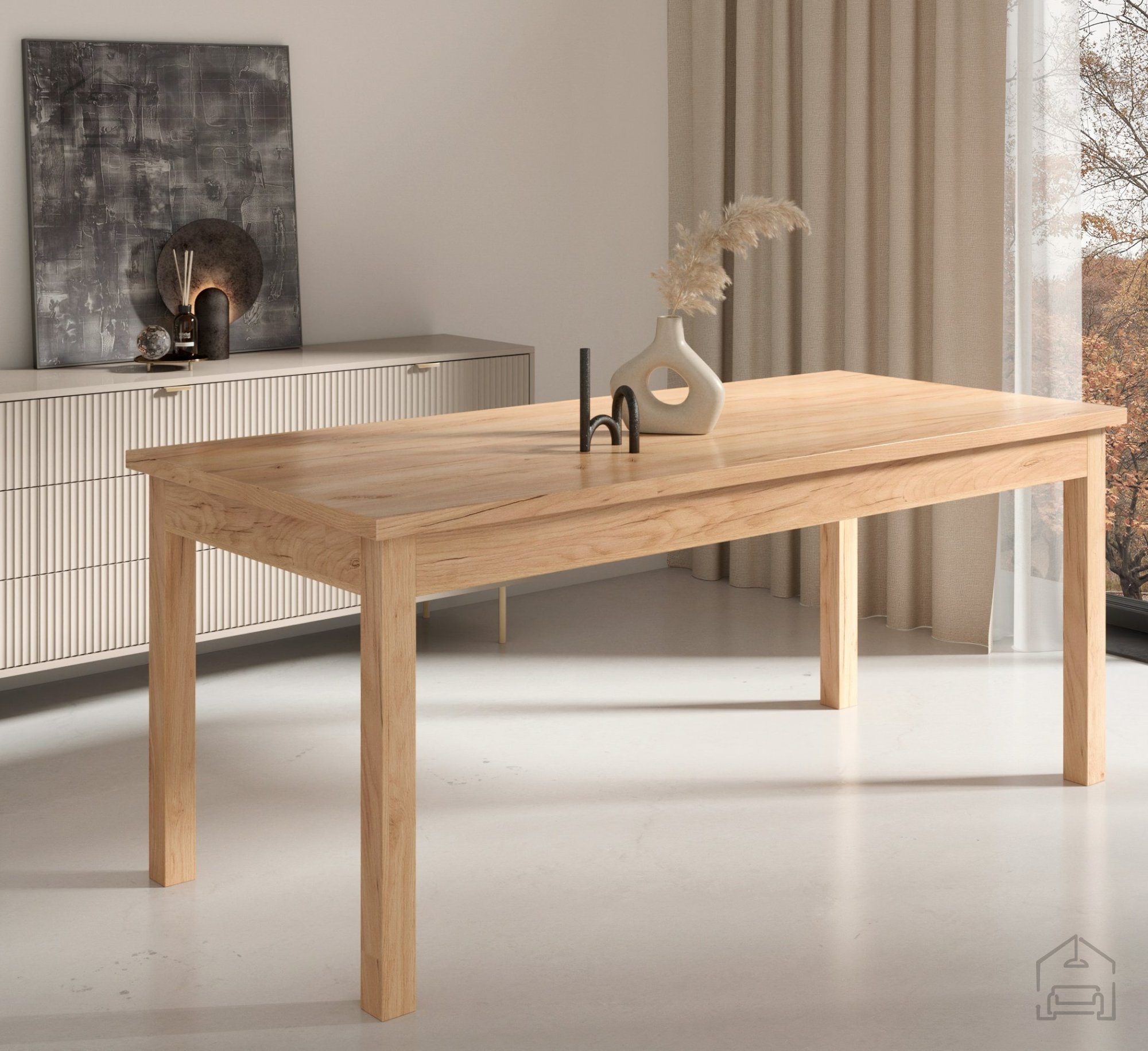 Der Esstisch besteht aus hochwertigem MDF-Material mit einem stabilen Rahmen aus Buchenholz, was für Langlebigkeit und Robustheit sorgt. Die Oberfläche im warmen Naturton Craft Gold imitiert die Struktur echten Holzes und verleiht dem Raum ein Gefühl von Natürlichkeit und Behaglichkeit. Der Tisch lässt sich wunderbar mit verschiedensten Stuhlarten und Einrichtungsstilen kombinieren – von rustikal bis minimalistisch.