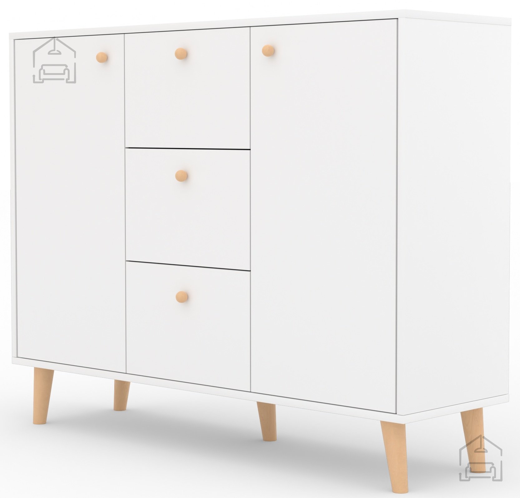 Die Kommode verfügt über drei großzügige Schubladen, zwei praktische Regalfächer und zwei Drehtüren, die reichlich Stauraum bieten. So haben Sie genügend Platz für Kleidung, Dokumente, Bücher oder Dekorationsartikel. Ein besonderes Highlight sind die Holzgriffe und -füße, die der Kommode eine natürliche, warme Note verleihen und zugleich für Stabilität sorgen. Die Fußhöhe von 16 cm ermöglicht ein einfaches Reinigen darunter und trägt zusätzlich zum eleganten Erscheinungsbild des Möbelstücks bei.