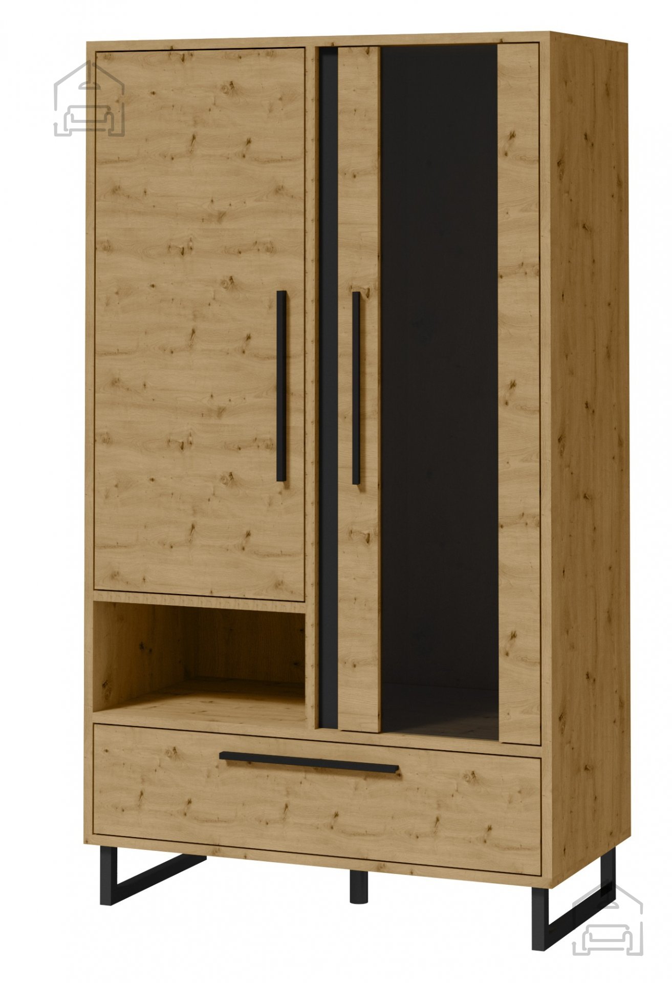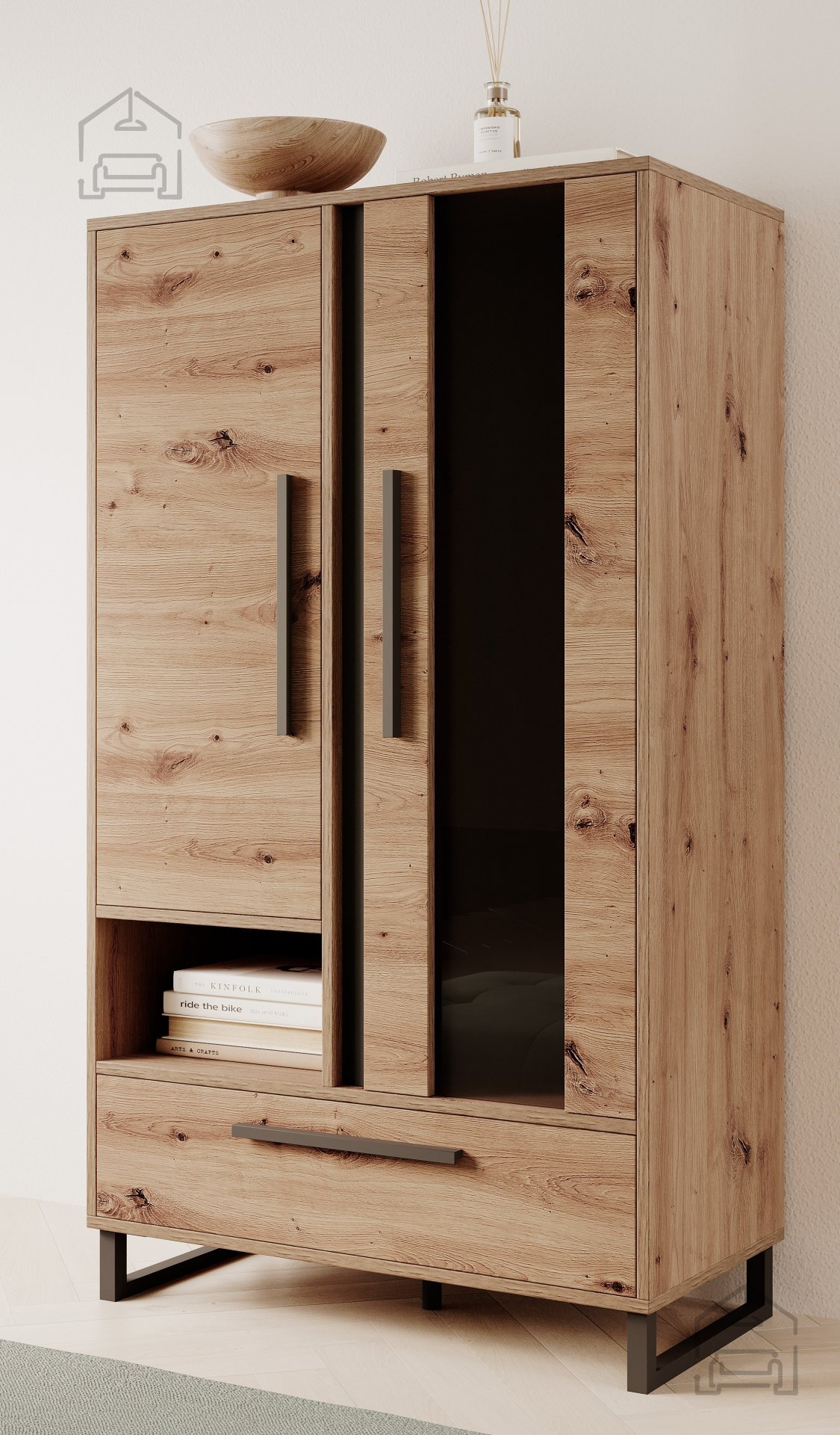 Dank ihrer klaren Form und geradlinigen Silhouette lässt sich die Vitrine mühelos mit unterschiedlichen Einrichtungsstilen kombinieren – ob industriell, skandinavisch, klassisch oder minimalistisch. Die Holzoptik in Artisan-Eiche bringt Natürlichkeit und Wärme in den Raum, während das schwarze Metallgestell einen modernen, robusten Akzent setzt. Gefertigt ist das Möbelstück aus einer hochwertigen laminierten Möbelplatte, die Langlebigkeit und Widerstandsfähigkeit im Alltag garantiert. Ergänzende Elemente aus Metall und Glas sorgen für einen stilvollen Kontrast, der sofort ins Auge fällt.