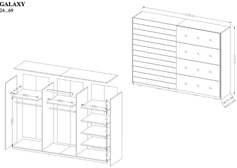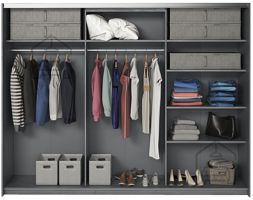 Der Kleiderschrank Galaxy wurde mit Blick auf Benutzerfreundlichkeit entworfen. Das Innere ermöglicht eine einfache Organisation und ein schnelles Auffinden Ihrer Kleidung. Regale und Kleiderstangen lassen sich flexibel anpassen, sodass Sie sowohl lange Kleidungsstücke als auch kleinere Accessoires optimal verstauen können – für eine bestmögliche Raumnutzung.