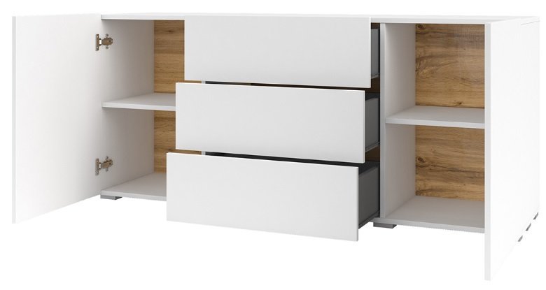 Die Wotan-Eiche bringt eine warme, natürliche Note in den Raum und harmoniert wunderbar mit verschiedensten Einrichtungsstilen – von klassisch bis modern. Das Weiß sorgt zusätzlich für Helligkeit und eine freundliche Atmosphäre, wodurch die Kommode zu einem vielseitigen Möbelstück für jedes Zuhause wird.