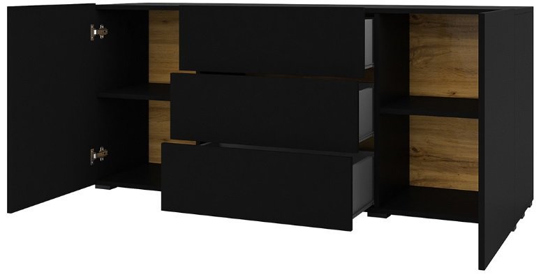 Wir präsentieren Ihnen die Kommode Ava, ein Teil der modularen Möbelkollektion AVA, die für alle entworfen wurde, die moderne Einrichtungslösungen schätzen. Mit den Maßen 140x35x63 cm und gefertigt aus hochwertiger, laminierten Platte bietet diese Kommode eine perfekte Verbindung von Stil und Funktion. Die Farbkombination aus schwarzem Onyx und Wotan-Eiche verleiht dem Möbelstück eine edle Note, die sich harmonisch in jedes moderne Wohnzimmer oder Schlafzimmer einfügt.