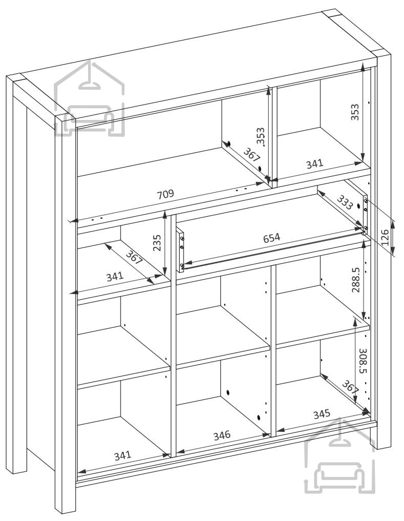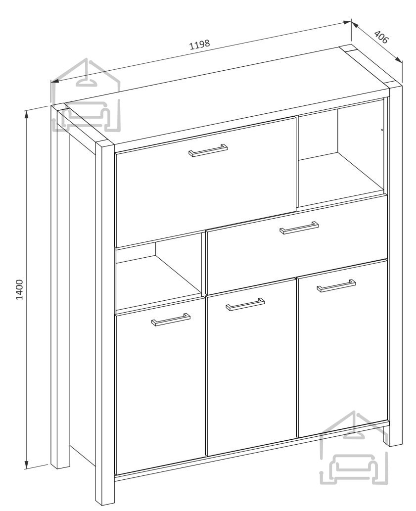 3 Fächer mit Türen und Einlegeböden, 1 Fach mit Klappe, 1 Schublade, 1 offenes Regal