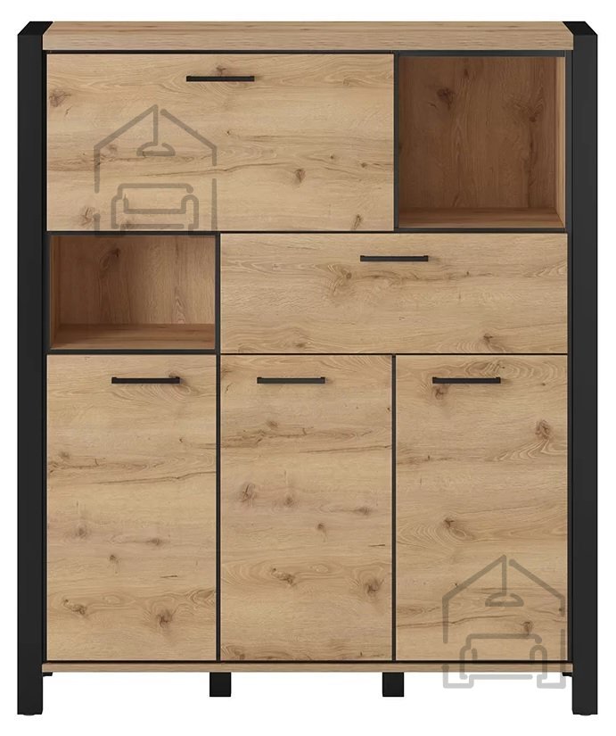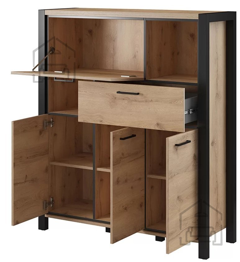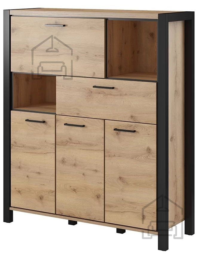 Die Wohnzimmerserie AKTIV ist im industriellen Stil gehalten, der sich durch klare Formen, robuste Optik und hohe Funktionalität auszeichnet. Die besondere Oberflächengestaltung verleiht jedem Raum einen individuellen Charakter. Die warme Holzfarbe mit ihrer natürlichen Maserung wird durch tiefes Schwarz eingerahmt – eine Kombination, die dynamisch, kontrastreich und zugleich harmonisch wirkt! Die Kollektion besteht aus mehreren Elementen, die sich flexibel kombinieren lassen, während praktische Designlösungen helfen, ein schönes und funktionales Wohnzimmer zu gestalten.