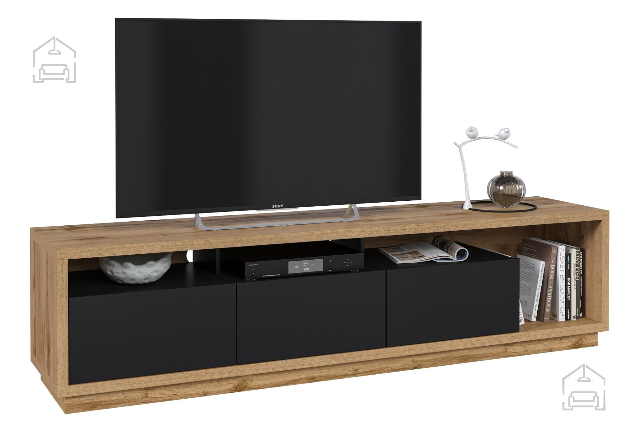 Die Kommode misst 200x45x50 cm und bietet damit ausreichend Platz für all Ihre Multimedia-Geräte und Zubehörteile. Gefertigt aus einer hochwertigen Möbelplatte, besticht sie durch Stabilität und Langlebigkeit. Die Oberfläche in der Kombination aus Wotan-Eiche und Schwarz matt sorgt für einen modernen, eleganten Look, der sich mühelos in verschiedenste Einrichtungsstile einfügt.