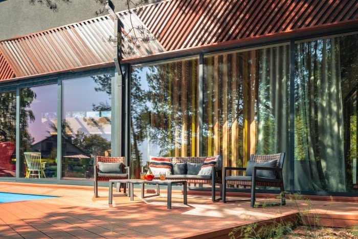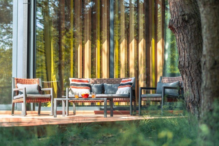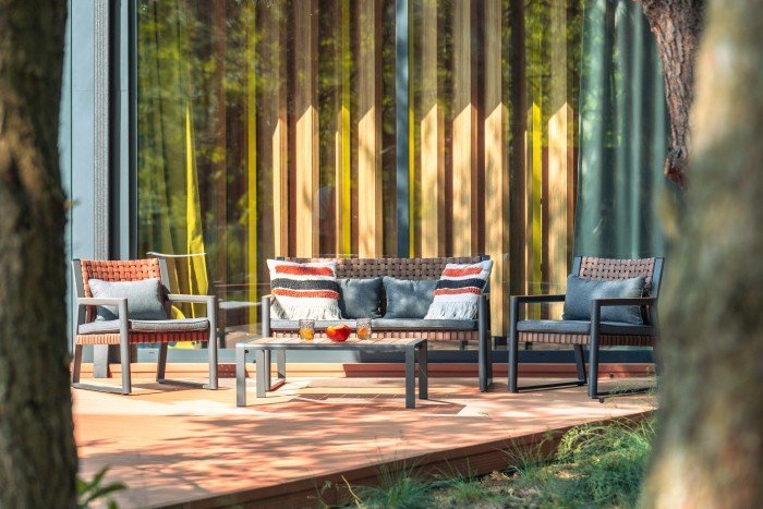 Die Sitzflächen von Sofa und Sesseln sind mit weichen Polyesterkissen ausgestattet. Dieses Material ist besonders feuchtigkeitsresistent und lässt sich leicht reinigen. Zusammen mit den Armlehnen und der ergonomischen Form entsteht so ein Sitzkomfort, der zum Entspannen einlädt.