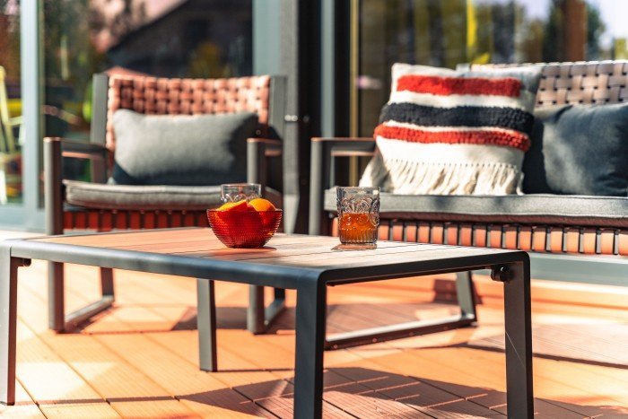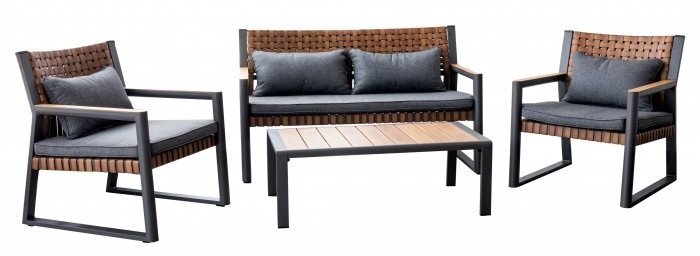 Dieses bequeme Set für 4 Personen ist ideal, um Terrasse, Garten oder Balkon gemütlich zu gestalten. Das Set besteht aus einem 2-Sitzer-Sofa, zwei Sesseln und einem Tisch. Das Ensemble im modernen Landhausstil passt perfekt zu jedem zeitgemäß eingerichteten Außenbereich. Der Aluminiumrahmen sorgt für Stabilität und schützt vor Verformungen. Die Sitzflächen aus flach geflochtenem, synthetischem Rattan sind wasserfest, UV-beständig und unempfindlich gegenüber Lichteinwirkung. Dank der hochwertigen Materialien bleibt das Möbelset lange schön und funktional.