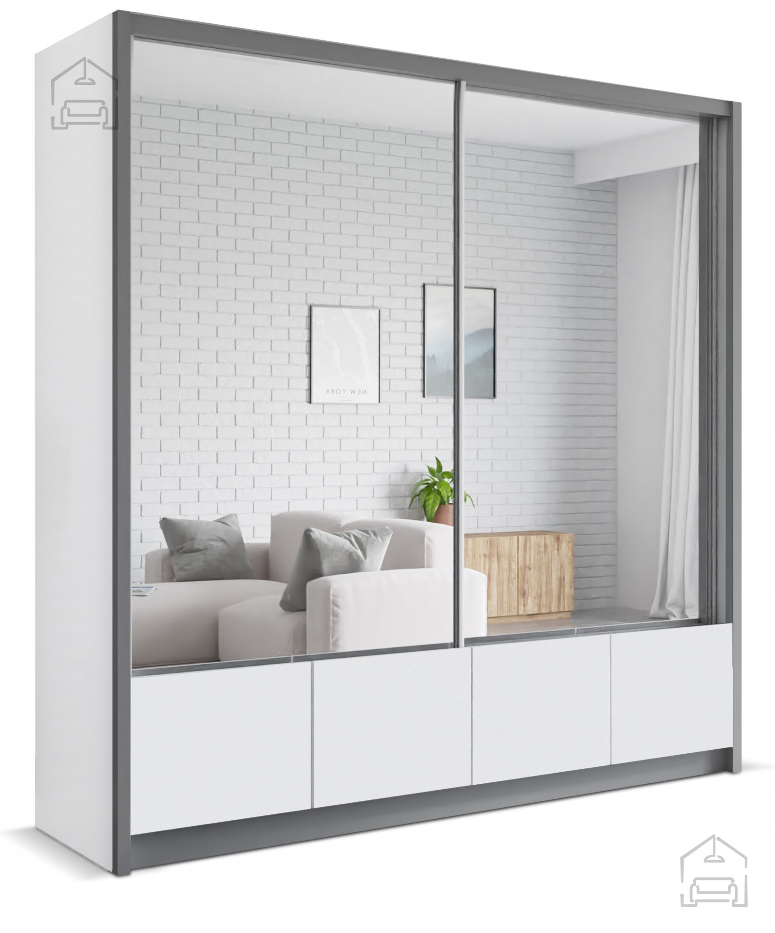Der Kleiderschrank mit Schiebetüren Luis 200 ist ein stilvolles und funktionales Möbelstück, das Ihr Schlafzimmer perfekt ergänzt. Er ist in einer Kombination aus Weiß mit grauen Akzenten erhältlich, was ihm ein modernes und elegantes Erscheinungsbild verleiht.