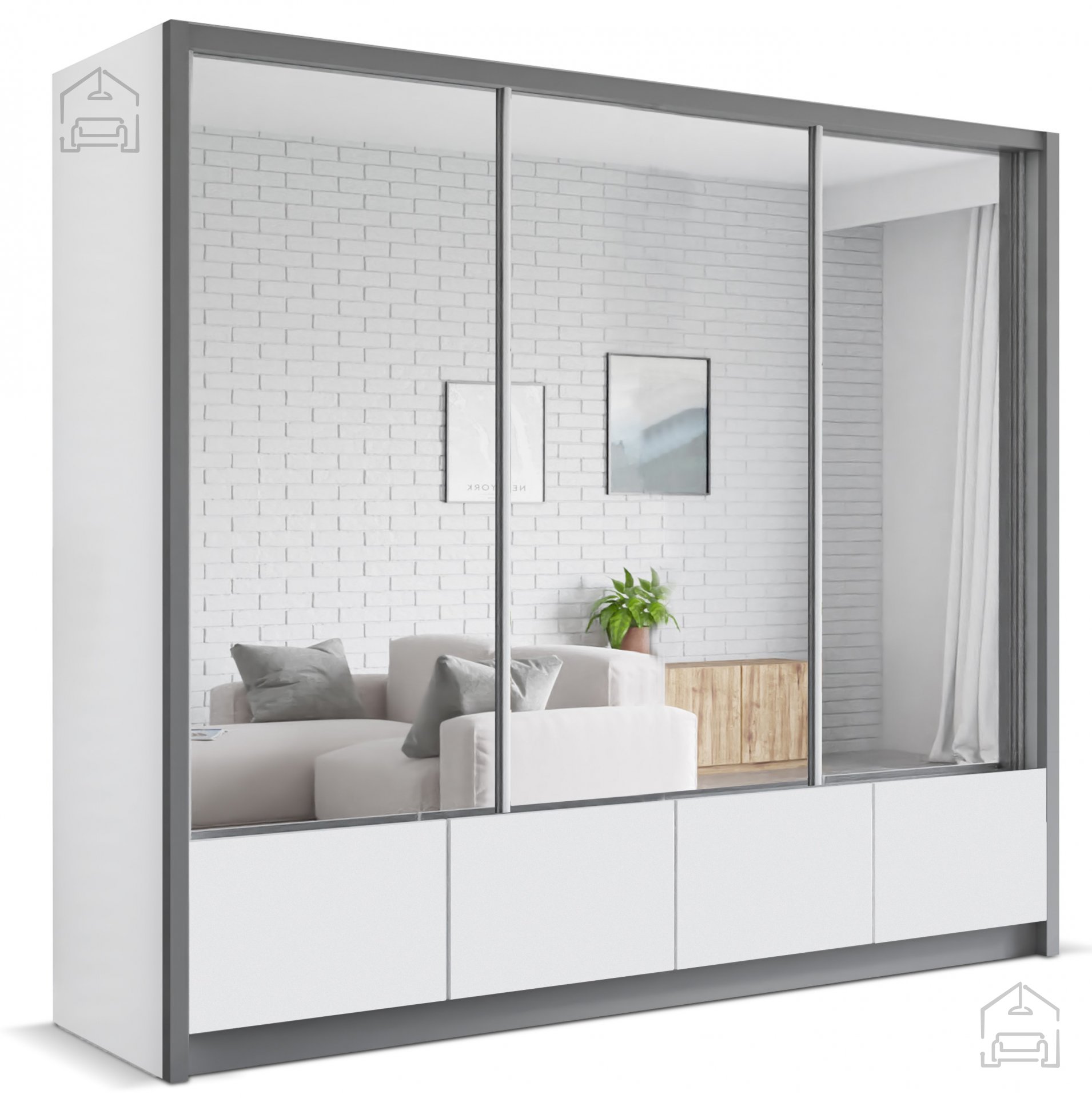 Der Kleiderschrank mit Schiebetüren Luis 250 ist ein stilvolles und zugleich funktionales Möbelstück, das Ihr Schlafzimmer perfekt ergänzt. Er ist in Weiß mit grauen Akzenten erhältlich, was ihm ein modernes und elegantes Erscheinungsbild verleiht.