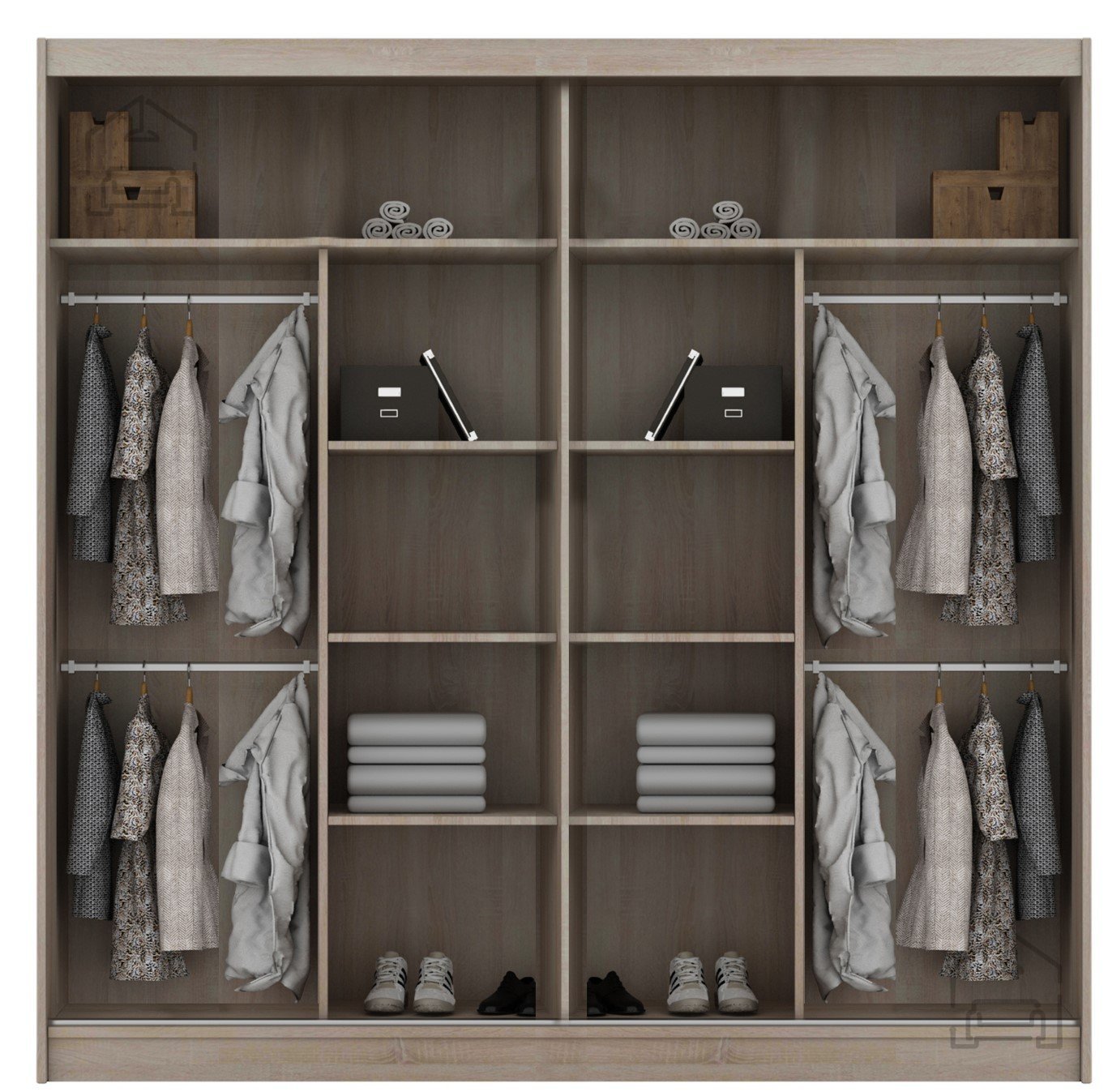 Das Innere des Schranks ist so gestaltet, dass es großzügigen Stauraum bietet. Es gibt ausreichend Platz zum Aufhängen von Kleidung, zum Verstauen gefalteter Stücke, von Schuhen oder anderen persönlichen Gegenständen. Die Anordnung von Regalen und Kleiderstangen kann individuell angepasst werden, um eine effiziente Organisation der Garderobe zu ermöglichen. Diese Flexibilität ist besonders praktisch in Haushalten mit unterschiedlichen Kleidungsstücken und Accessoires, da der Inhalt übersichtlich und leicht zugänglich bleibt.
