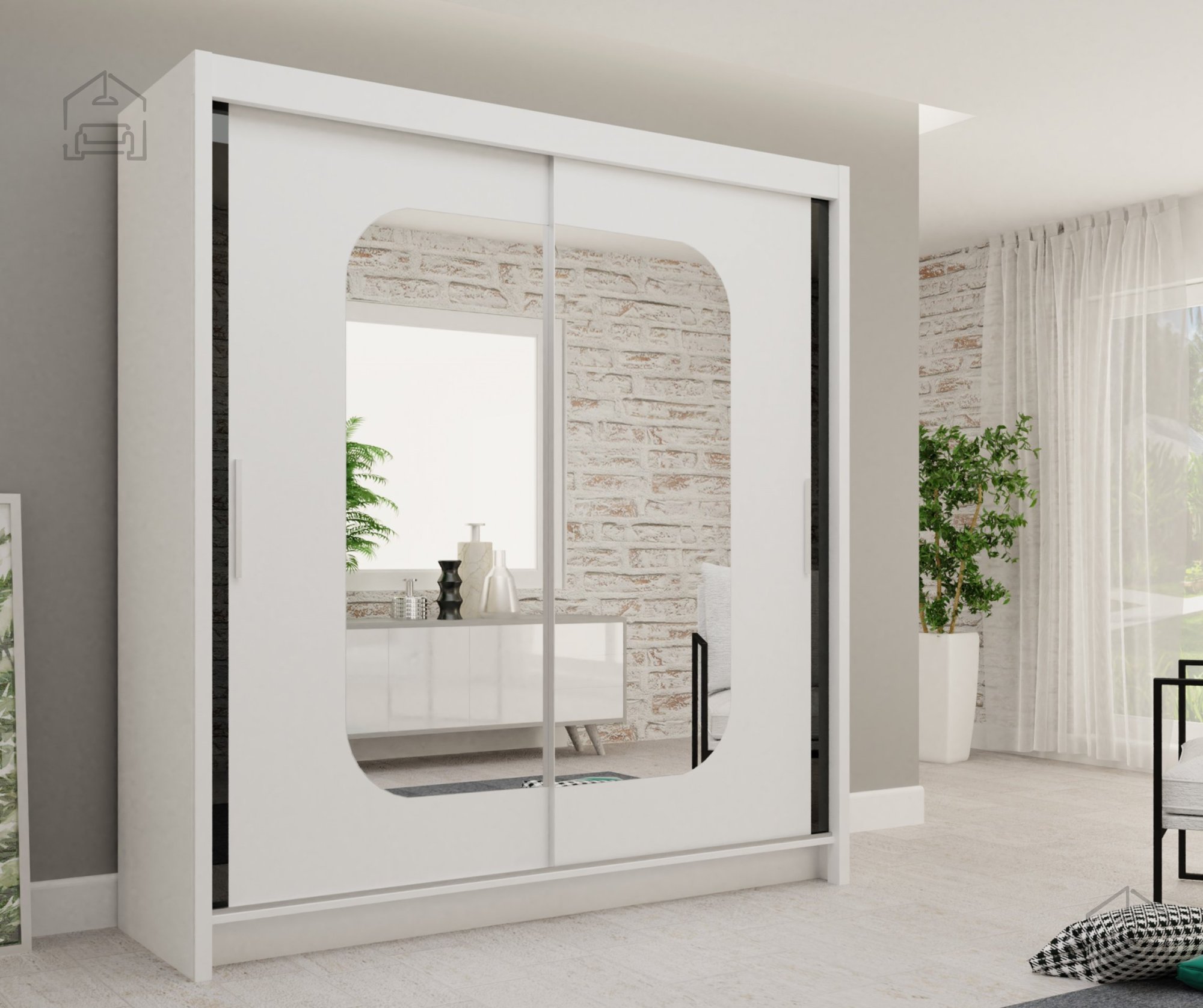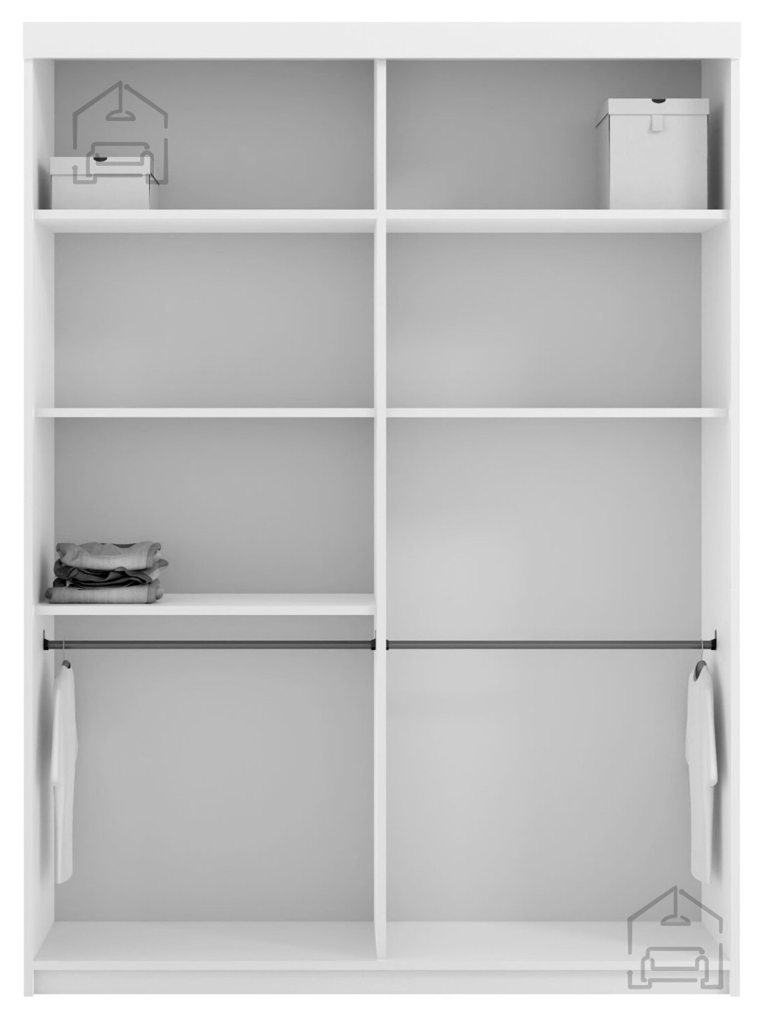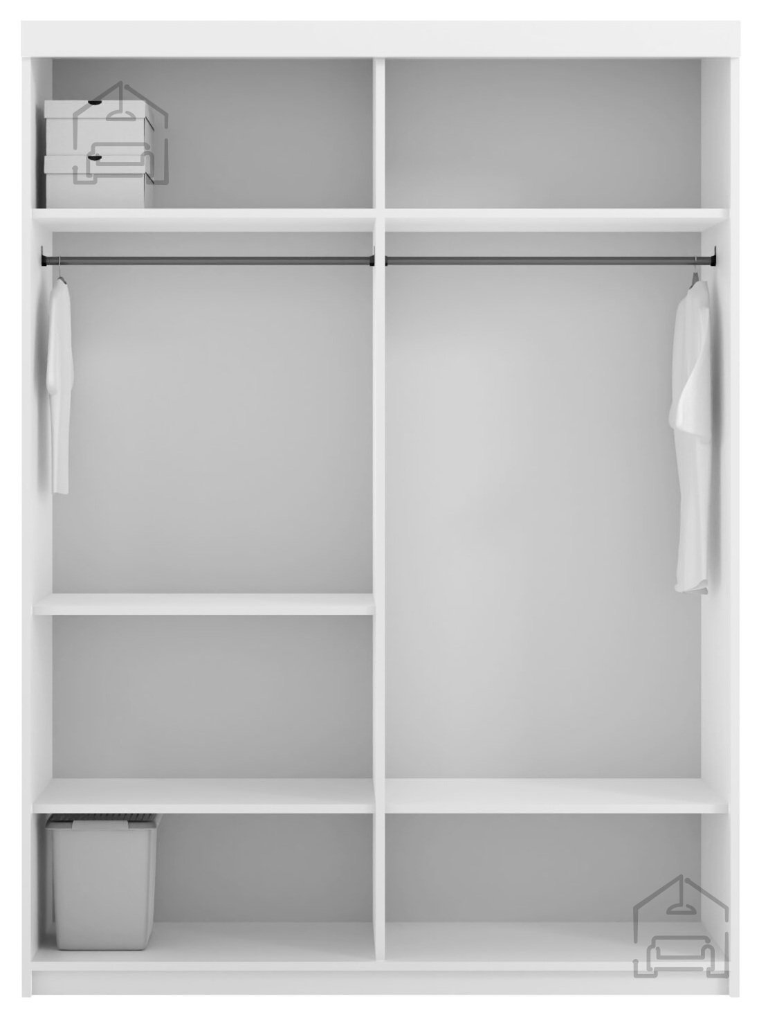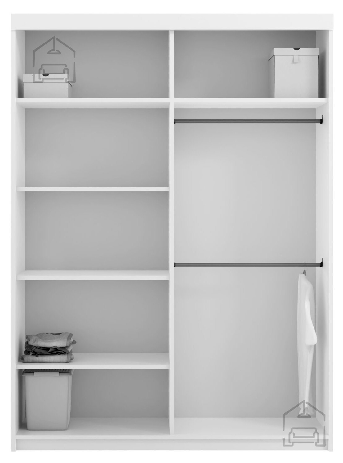 Der Kleiderschrank mit Schiebetüren Marika 150 ist mehr als nur ein funktionales Möbelstück – er ist auch ein stilvolles Element, das den Raum optisch aufwertet. Klare Linien, helle Oberflächen und dezente Details verleihen ihm ein modernes, zugleich aber wohnliches Erscheinungsbild. Dank der neutralen weißen Farbe lässt er sich leicht mit verschiedenen Farbtönen und Materialien kombinieren – sei es mit warmen Holzelementen oder kühlen Metalleffekten. Der Spiegel an der Front ist nicht nur dekorativ, sondern auch praktisch – ideal, um schnell das Outfit zu überprüfen und dem Raum zusätzlich Licht zu verleihen.