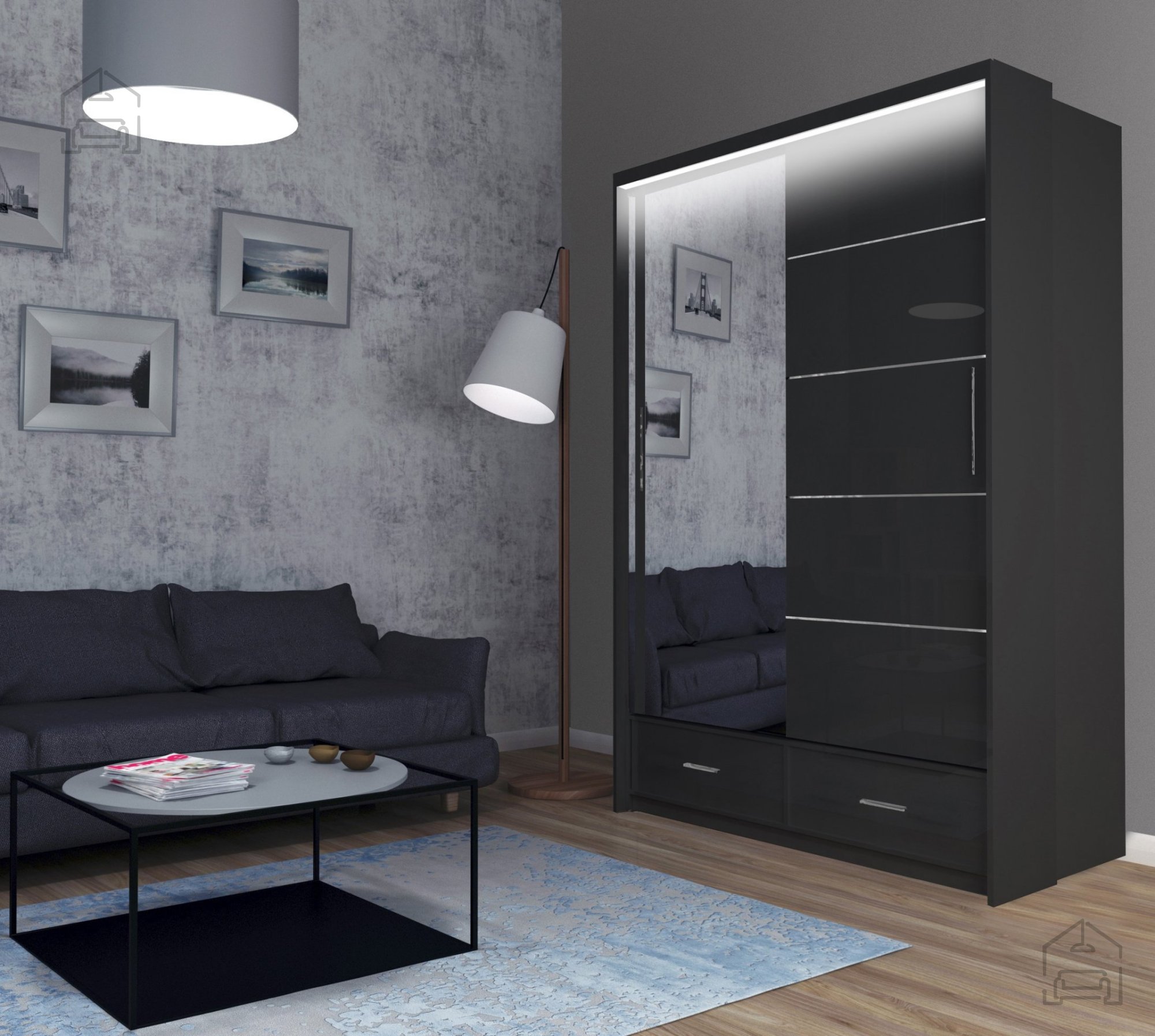 Farbauswahl: Der Schrank ist in verschiedenen Kombinationen von Korpusfarben (Grau, Weiß, Schwarz) und Fronten (grau glänzend, weiß glänzend, schwarz glänzend) erhältlich, sodass Sie das Design ganz nach Ihrem Geschmack und Ihrer Einrichtung anpassen können.