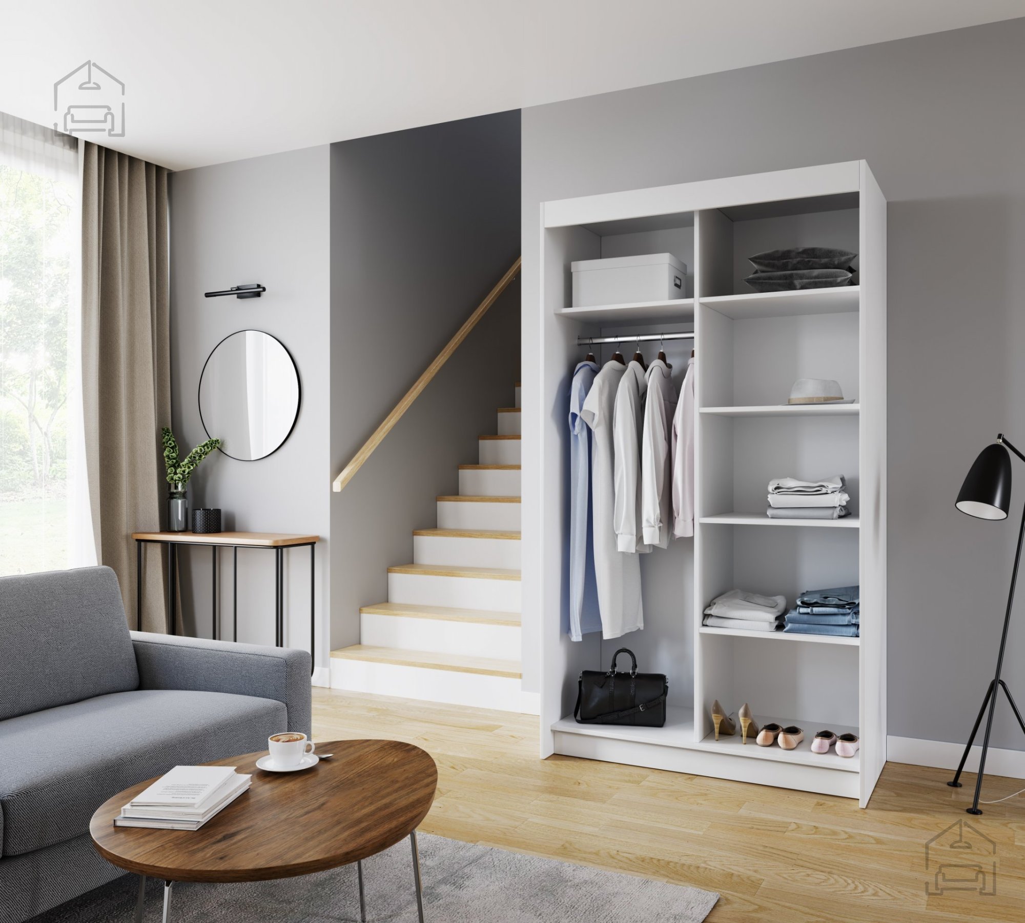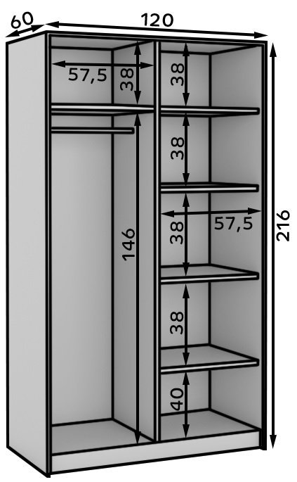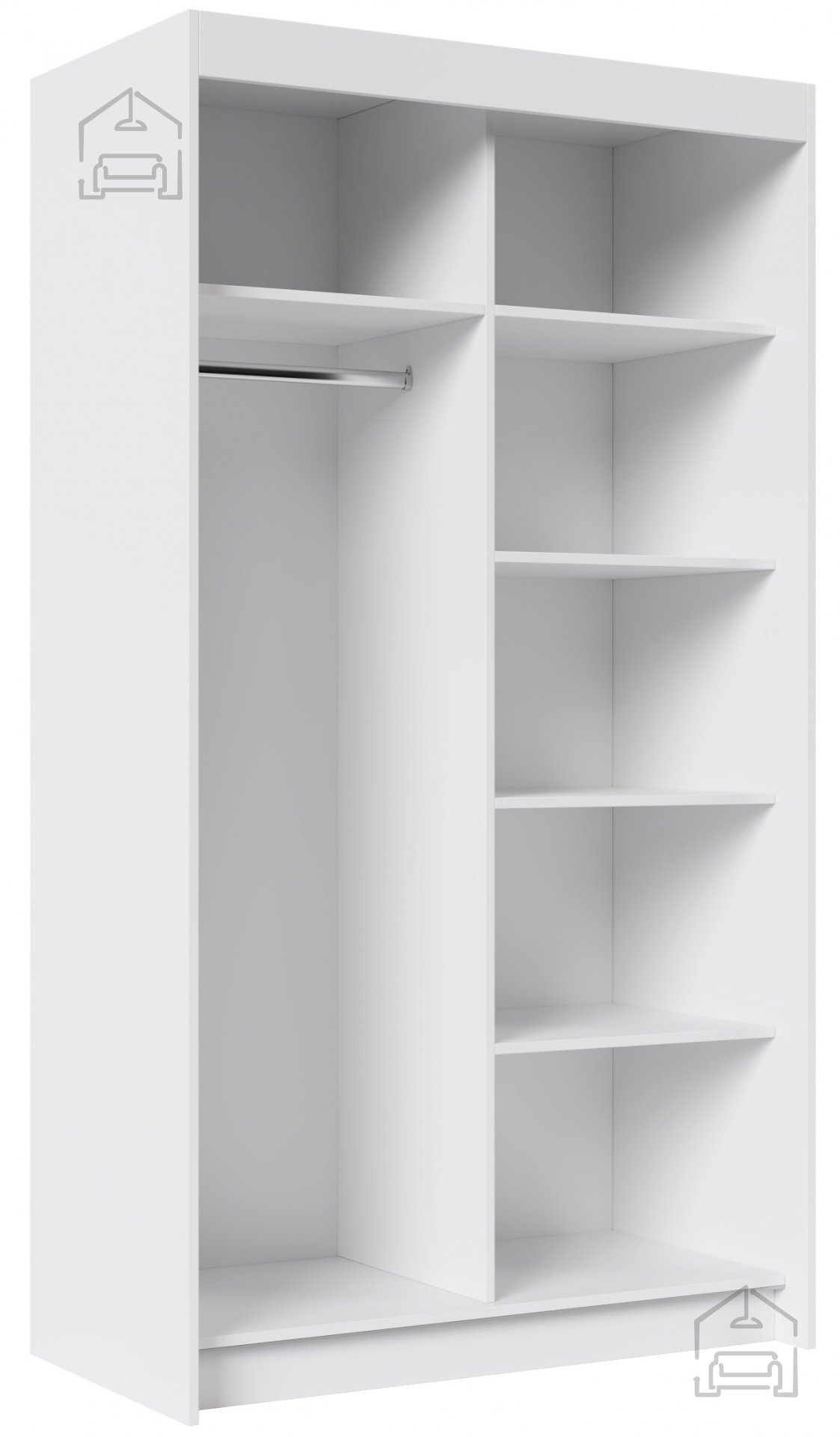 Die Inneneinteilung ist praktisch gestaltet: Auf der einen Seite befinden sich geräumige Regalfächer für T-Shirts, Pullover oder Bettwäsche, auf der anderen Seite eine Kleiderstange, an der Ihre Kleidung, Hemden und Mäntel ordentlich und faltenfrei hängen. So behalten Sie immer den Überblick über Ihre Garderobe und haben alles schnell zur Hand.