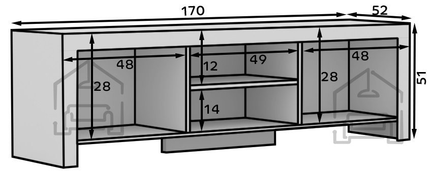 Mit den Maßen 170x52x51 cm bietet das Lowboard ausreichend Platz für Ihren Fernseher sowie für zusätzliche Geräte wie Spielkonsolen, DVD-Player oder Soundanlagen. Zwei geräumige Schränke mit Türen schaffen dezenten Stauraum für Kabel, Fernbedienungen, Zeitschriften und andere Accessoires, die sonst den aufgeräumten Eindruck stören würden. Auf der oberen Ablage können Sie neben dem Fernseher auch Dekorationen wie Blumen, Kerzen oder Familienfotos platzieren und so Ihrem Raum eine persönliche Note verleihen.